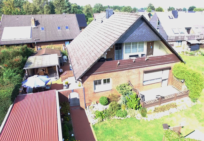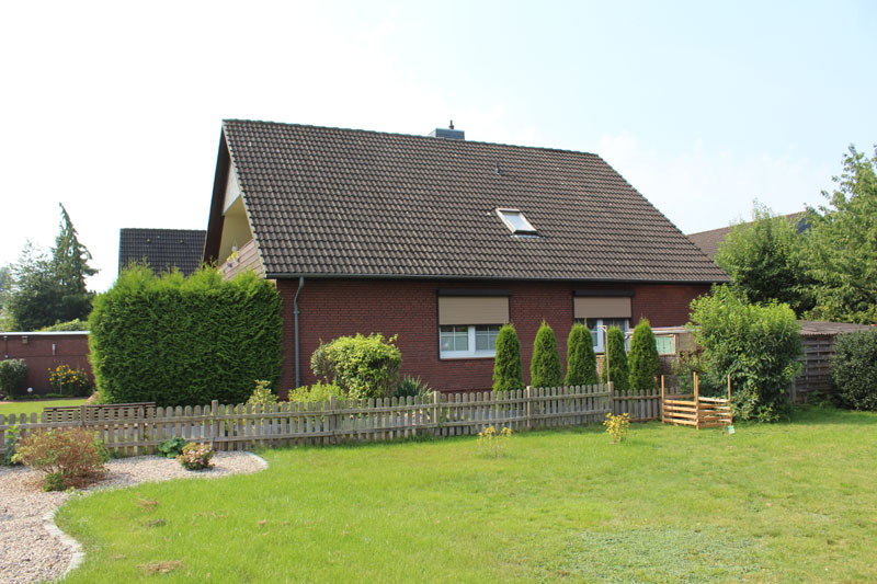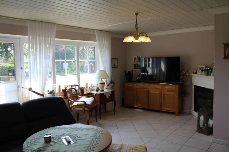 Die zurzeit selbstgenutzte Wohnung im Erdgeschoss verfügt über einen Eingangsvorraum (Windfang) und einen großen Flur/Diele. Neben dem Eingang befindet sich das Gäste-WC. Dieses wurde 2006 komplett erneuert. Die angrenzende Küche stammt ebenfalls aus 2006 und bietet ausreichend Platz für eine Sitzmöglichkeit. Neben dem mit über 30 m² großen Wohn- und Essbereich stehen noch drei weitere Zimmer zur Verfügung. Diese könnten als Kinder-, Arbeits-, und/oder Gästezimmer genutzt werden. Das barrierefreie Badezimmer verfügt über einen großen Duschbereich und wurde ebenfalls 2006 komplett erneuert. Das komplette Erd- und Dachgeschoss verfügt über eine Fußbodenheizung. Die Warmwasseraufbereitung in beiden Etagen erfolgt über Boiler. Die doppelverglasten Kunststofffenster mit innenliegenden Sprossen stammen auch aus 2006.