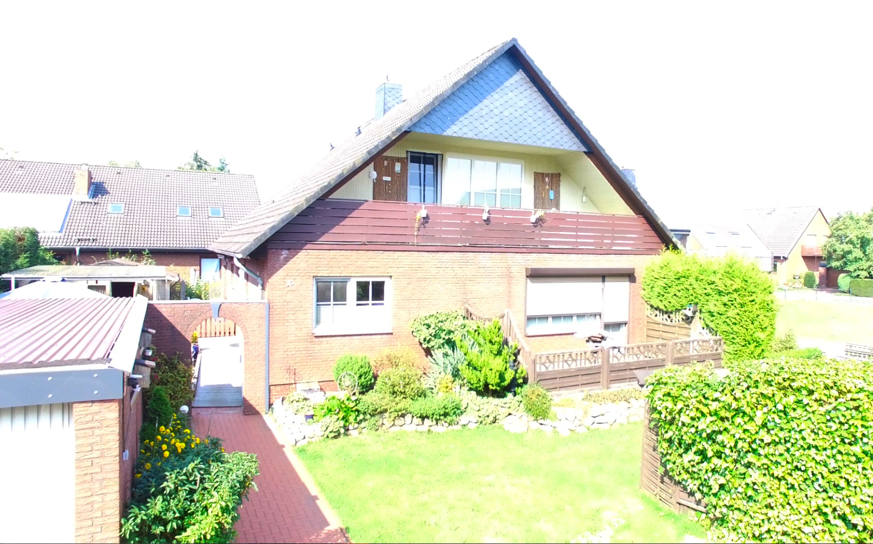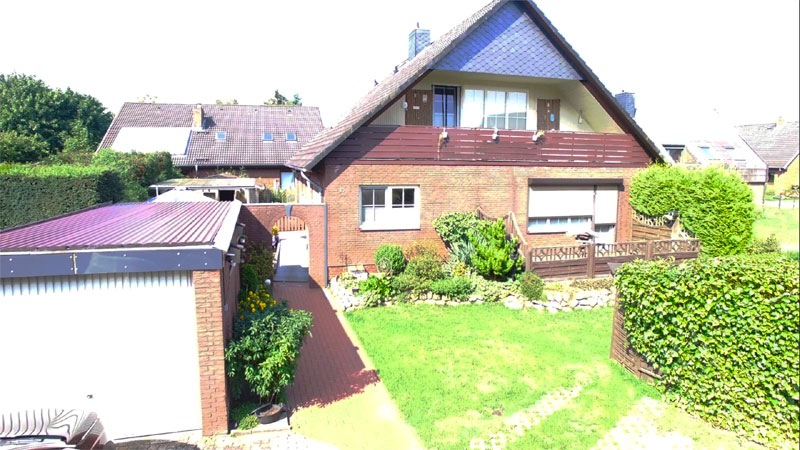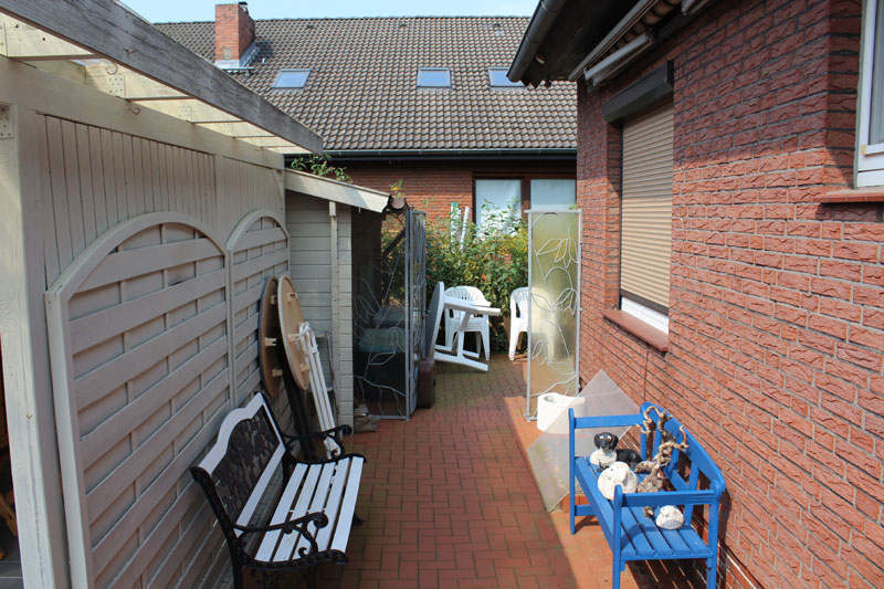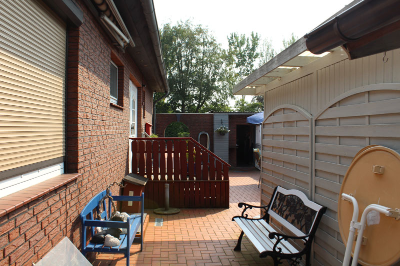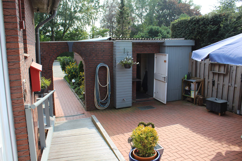 Das Haus verfügt weiter über eine Garage mit Abstellraum und WC. Ferner befinden sich vor der Garage und neben der Auffahrt von weitere Stellplatzmöglichkeiten. Außerdem gibt es zwei Terrassen, einen Holzpavillon, ein Gartenhaus sowie einen Fahrrad- und Geräteschuppen. Eine Terrasse ist über die Erdgeschosswohnung zu erreichen und die andere Terrasse befindet sich vorm Hauseingangsbereich. Diese große und gepflegte Terrasse befindet sich in einem geschützten Bereich und lädt zum Verweilen ein.