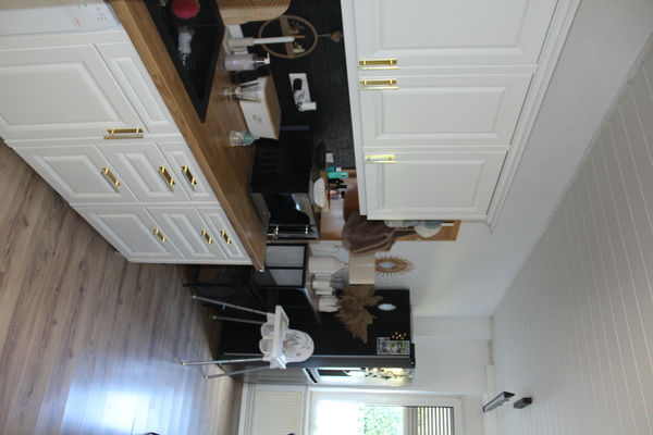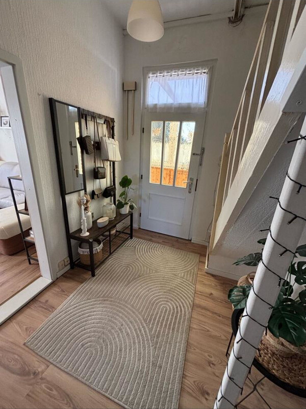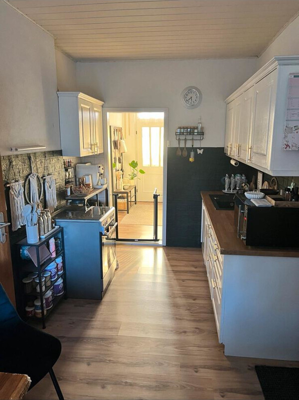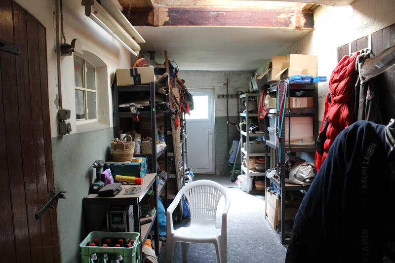 Im Erdgeschoss offenbart sich eine durchdachte Raumaufteilung: Das helle Wohn- und Schlafzimmer zur Straßenseite laden mit ihren großen Fenstern zum Entspannen ein, während die Küche am Ende des Flurs mit einer integrierten Sitznische Geselligkeit und Gemütlichkeit verbindet. Gegenüber finden sich das moderne Duschbad und ein separates WC, flankiert von einer praktischen Speisekammer und dem Hauswirtschaftsraum. Letzterer beherbergt die Heiztechnik, die im November 2024 durch eine effiziente Gas-Brennwerttherme mit Flüssiggas und 120 Litern Schichtenspeicher ersetzt wurde, sowie den Anschluss für Waschmaschine und Trockner. Über einen Zugang im Hauswirtschaftsraum (HWR) gelangen Sie in den kühlen Teilkeller, der sich ideal als Lagerraum eignet. Ebenso gelangt man vom HWR in den seitlichen Durchgang auf der Hausrückseite, über den man zur Garage und Werkstatt gelangt.