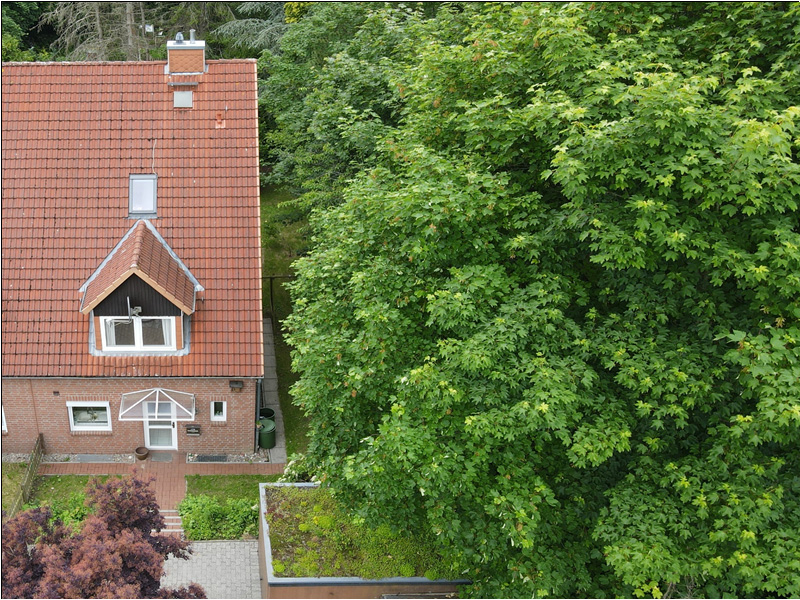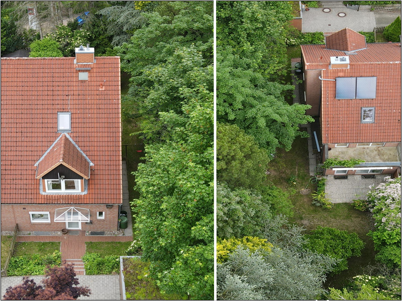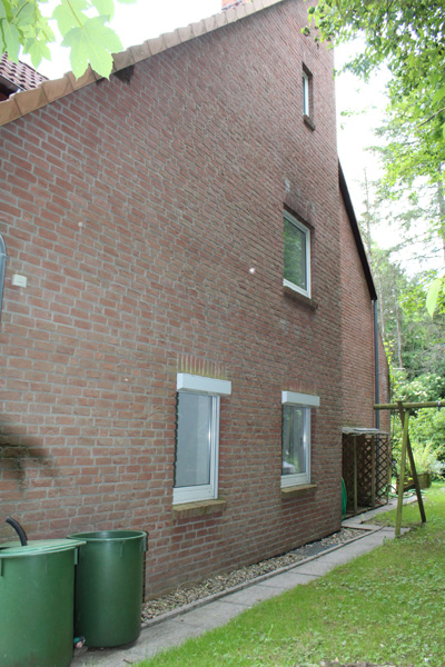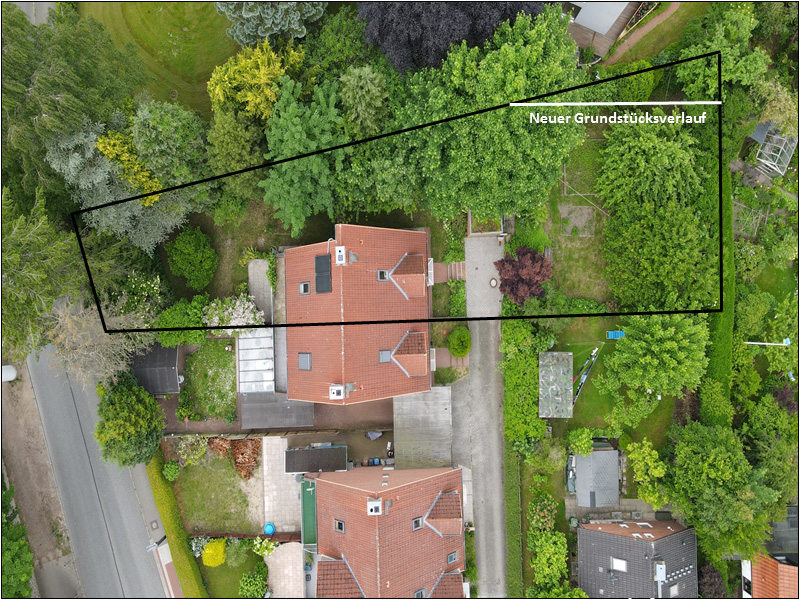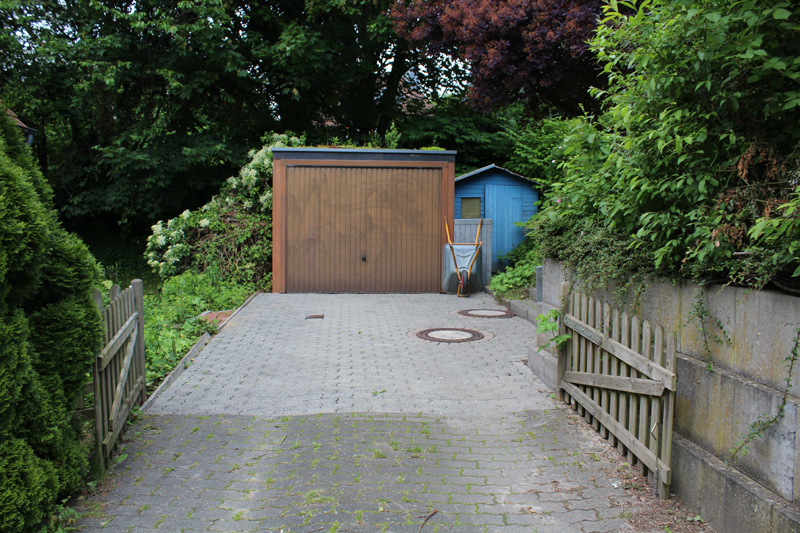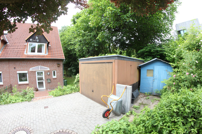 Weiter verfügt das Haus über einen überdachten Eingangsbereich und ein zweischaliges Mauerwerk mit einer rot-bräunlichen Fassade (Verblendstein). Zur Immobilie gehören auch noch eine Garage mit Gründach und ein kleines Gartenhaus (Schuppen für Gartengeräte). Da es sich um das letzte Haus in der Straße handelt, erstreckt sich das Grundstück bis auf die gegenüberliegende Straßenseite. Die Grundstücksgröße beläuft sich aktuell auf 798 m², wobei ein Teil von ca. 70 m² noch an den Nachbarn gehen soll, um den Grundstücksverlauf zu begradigen.
