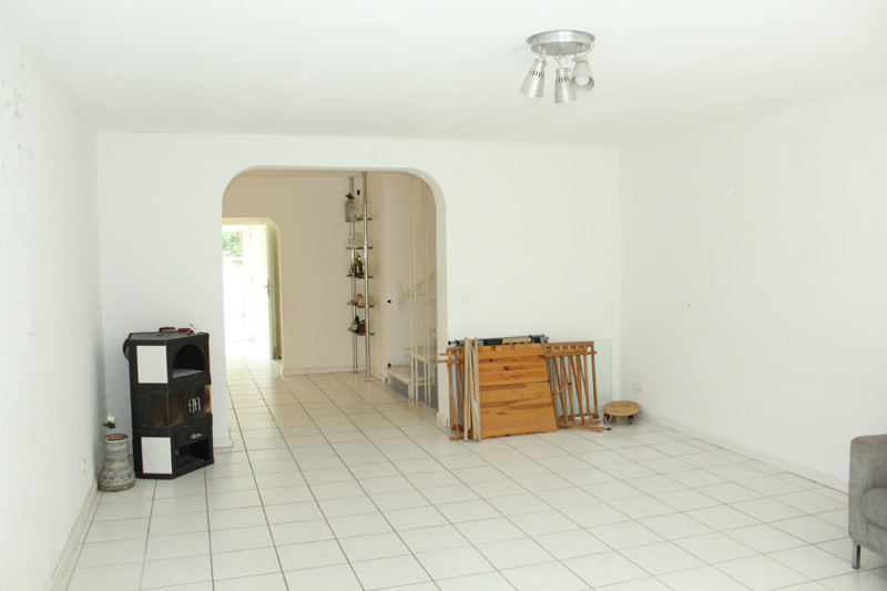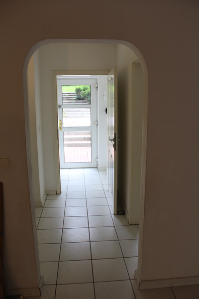 Nach dem man das Haus betreten hat, befindet sich auf der rechten Seite das Gäste-WC und angrenzend eine geräumige Garderobe, die viel Platz zur Verfügung stellt. Auf der linken Seite des Flures befinden sich die Küche und ein Abstellraum. Im Abstellraum können Vorräte (Speisen und Getränken) untergebracht werden, die für den täglichen Bedarf benötigt werden. Anzumerken ist noch, dass die Einbauküche über einen Gasherd verfügt. Über den Garderobenbereich gelangt man ins offene Wohn- und Esszimmer. Vom Wohnbereich gelangt man über eine Terassentür direkt auf die Terrasse und in den Garten. Das komplette Erdgeschoss ist weiß gefliest und im Wohnbereich befindet sich ein Kaminofen. Die Terrasse erstreckst sich fast über die komplette Hausbreite.