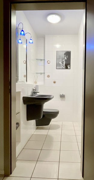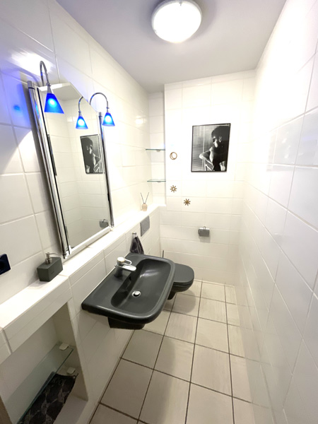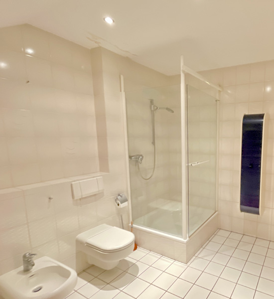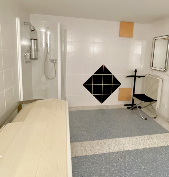 • Ruheraum mit Dusche, Handtuchheizkörper und wand hoch gefliest