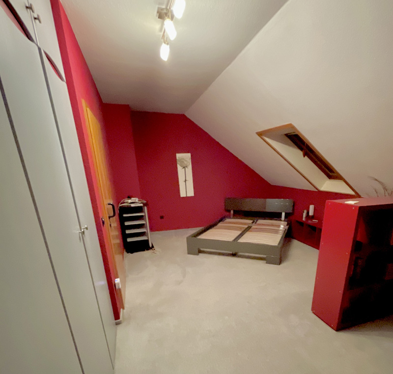 Im Dachgeschoss befinden sich neben dem Flur noch drei weitere Räume. Hierzu gehören das Badezimmer, das Elternschlafzimmer und ein Kinderzimmer. Im Vollbad sind eine Dusche und eine Eckbadewanne installiert. Das Elternschlafzimmer ist fast 18 m² groß und verfügt über einen integrierten Einbaubauschrank. Im Kinderzimmer können neben dem Bett problemlos noch ein Kleiderschrank und ein Schreibtisch untergebracht werden. Erwähnt werden muss auch noch, dass im Dachgeschoss eine Fußbodenerwärmung installiert wurde.