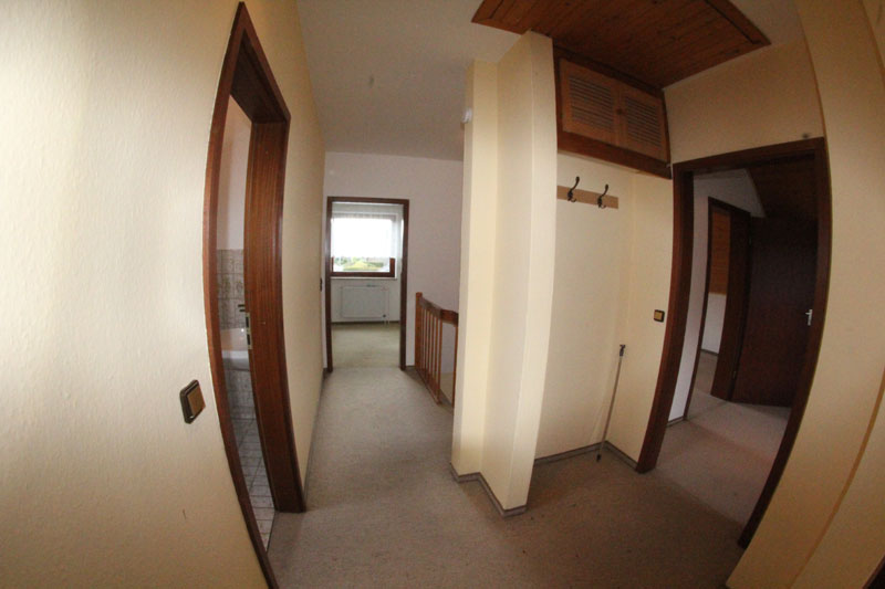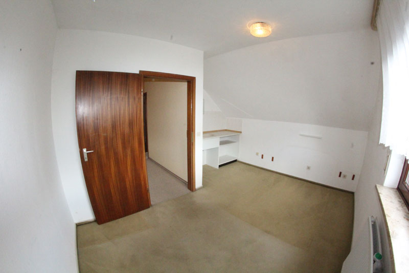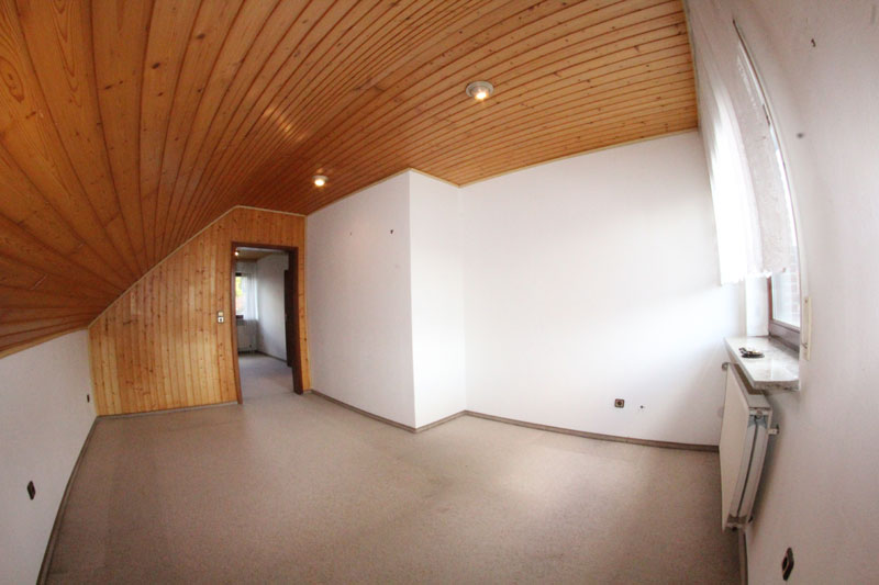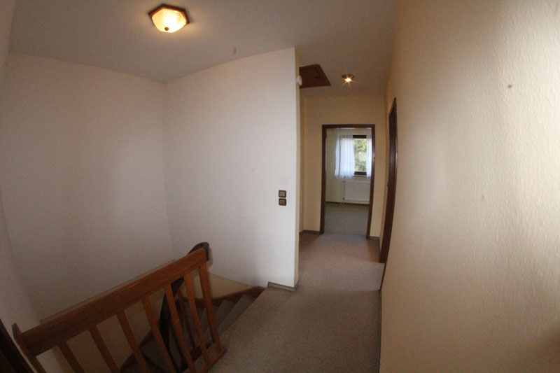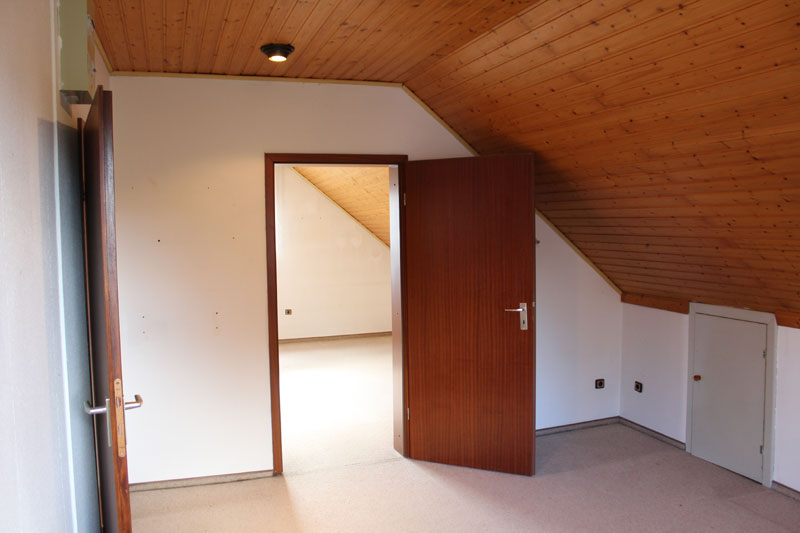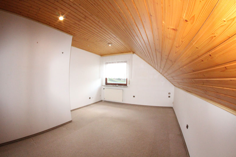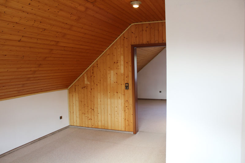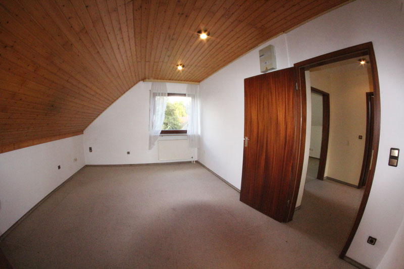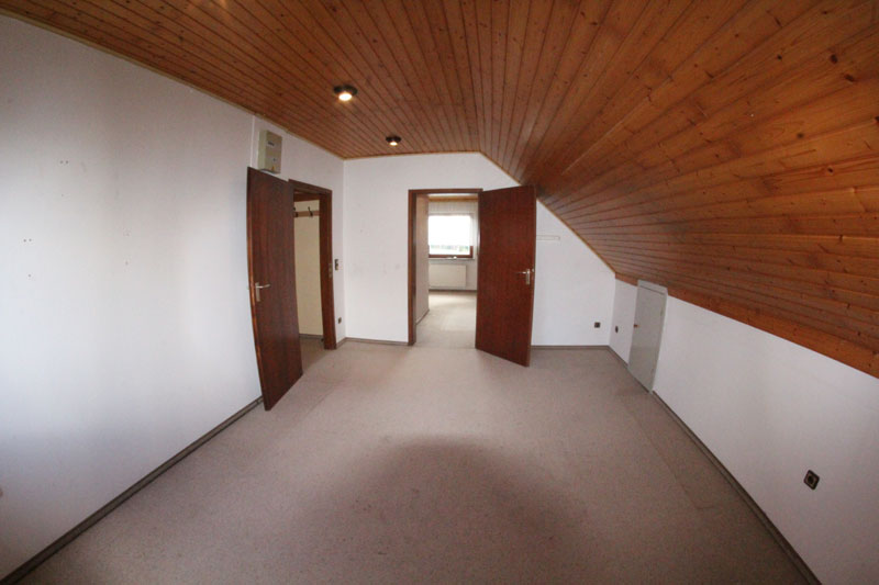 Am Kopfende des Flures gelangt man über eine U-förmige Holztreppe sowohl ins Dach- und Kellergeschoss. Im Dachgeschoss befinden sich neben dem Flur ein Badezimmer (Duschbad) und vier weitere Zimmer. Da alle Zimmer recht groß sind, können diese wahlweise als Kinder-, Schlaf- oder Arbeitszimmer genutzt werden. Anzumerken ist, dass ein Zimmer als Durchgangszimmer genutzt werden muss, um auch in das Zimmer zu kommen, welches keinen direkten Zugang vom Flur hat. Daher könnte dieses Zimmer beispielsweise auch als Ankleidezimmer dienen. Vom Flur gelangt man über eine Bodeneinschubtreppe in den nicht ausgebauten Spitzboden. Der Spitzboden stellt eine weitere Nutzfläche zur Verfügung, die als Abstellfläche genutzt werden könnte.