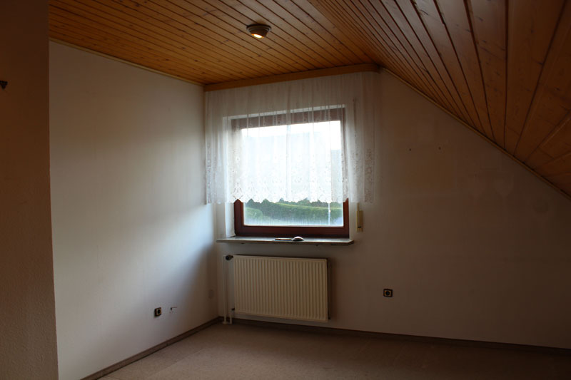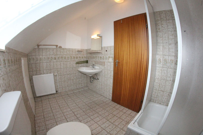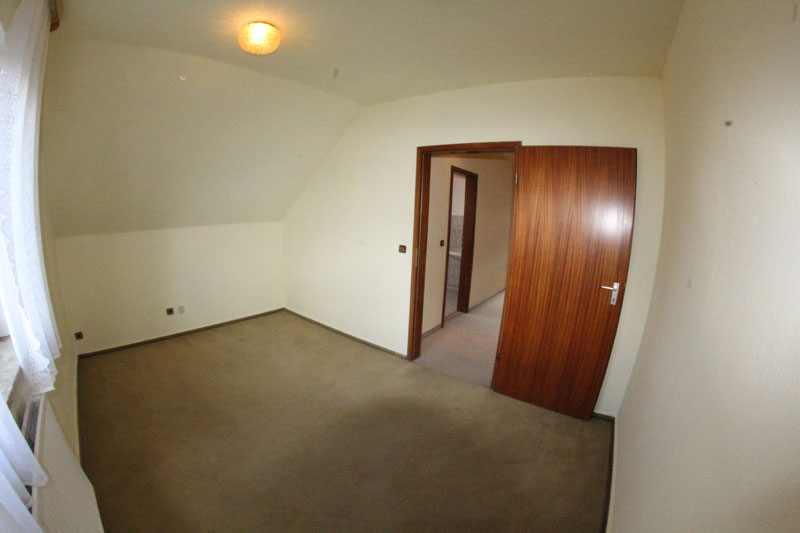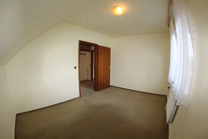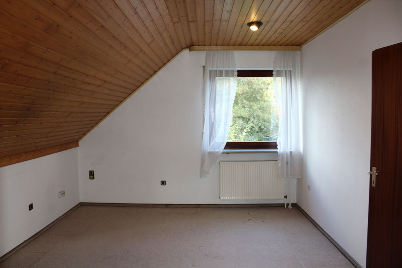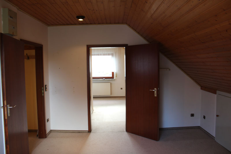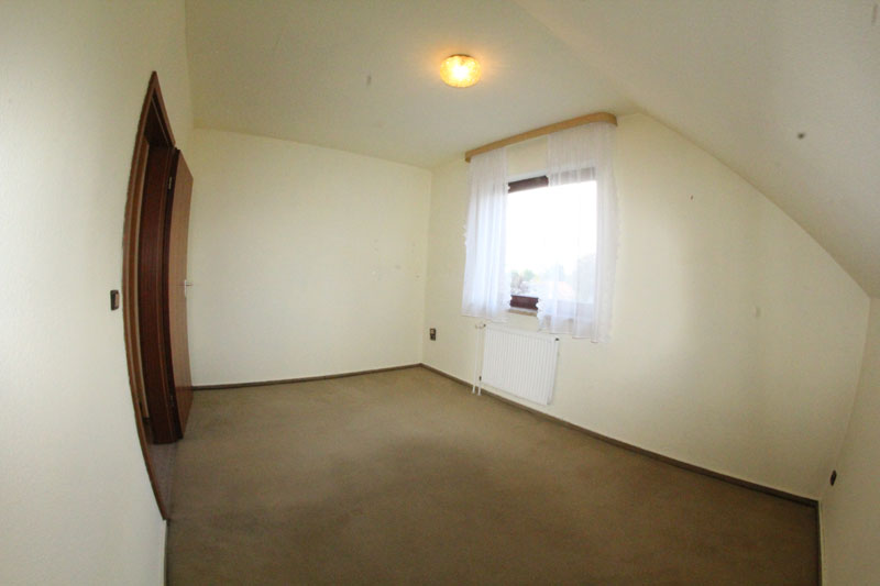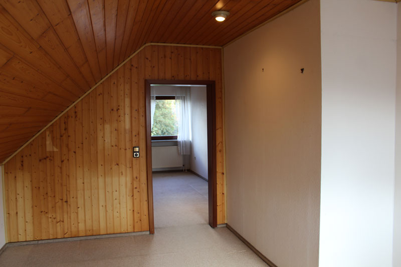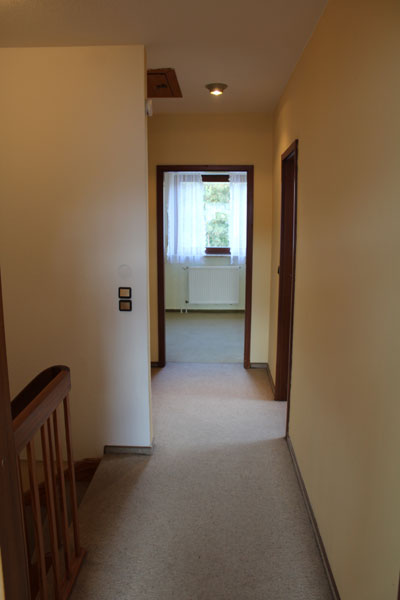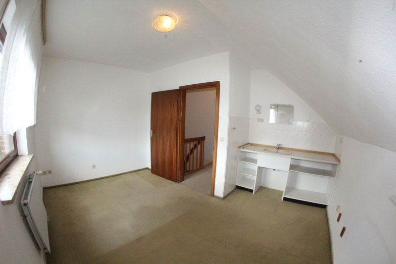 Am Kopfende des Flures gelangt man über eine U-förmige Holztreppe sowohl ins Dach- und Kellergeschoss. Im Dachgeschoss befinden sich neben dem Flur ein Badezimmer (Duschbad) und vier weitere Zimmer. Da alle Zimmer recht groß sind, können diese wahlweise als Kinder-, Schlaf- oder Arbeitszimmer genutzt werden. Anzumerken ist, dass ein Zimmer als Durchgangszimmer genutzt werden muss, um auch in das Zimmer zu kommen, welches keinen direkten Zugang vom Flur hat. Daher könnte dieses Zimmer beispielsweise auch als Ankleidezimmer dienen. Vom Flur gelangt man über eine Bodeneinschubtreppe in den nicht ausgebauten Spitzboden. Der Spitzboden stellt eine weitere Nutzfläche zur Verfügung, die als Abstellfläche genutzt werden könnte.