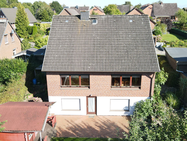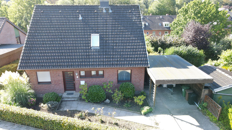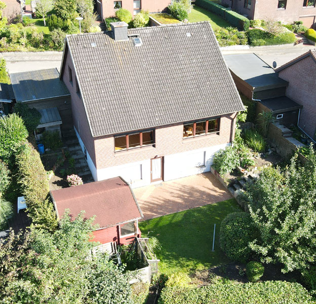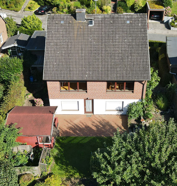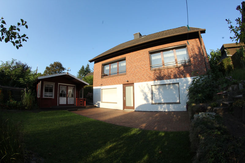 Das angebotene Einfamilienhaus mit Vollkeller wurde 1979 in massiver Bauweise errichtet. Es befindet sich auf einem 566 m² großen Grundstück in Hanglage. Aufgrund der Hanglage ist der Kelleranteil auf der Hausrückseite nicht unterirdisch verbaut. Neben dem Kellergeschoss verfügt das Haus noch über ein Erd- und Dachgeschoss. Das Haus ist weiter mit einem Satteldach ausgestattet und im Bereich des Erd- und Dachgeschosses mit einem Klinker versehen. Ferner gehören zum Haus ein Carport, ein Gartenhaus und eine große Terrasse. Die Wohnfläche liegt bei ca. 159,07 m² und die Nutzfläche beträgt ca. 81 m². Zudem verfügt die Immobilie über zwei Hauseingänge (Auf der Hausvorder- und Hausrückseite), so dass der Kellerbereich als Einliegerwohnung genutzt werden könnte.