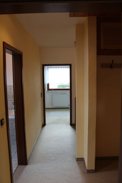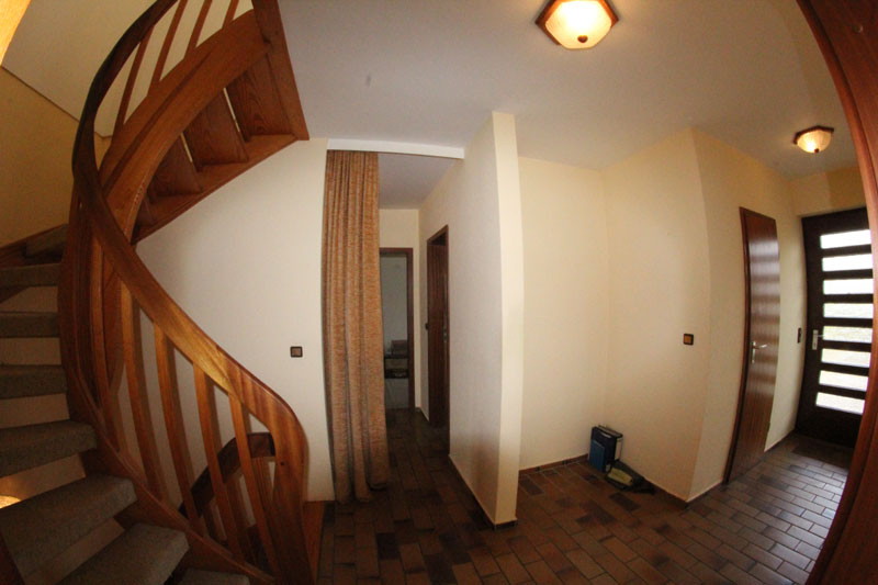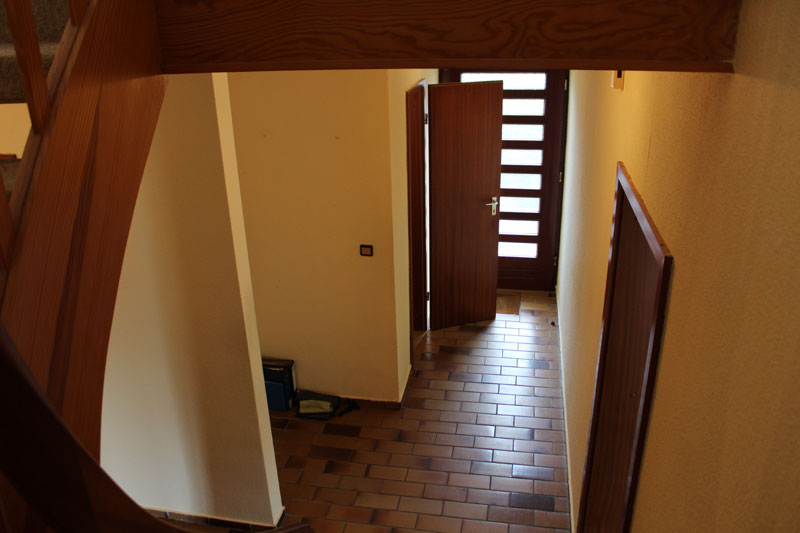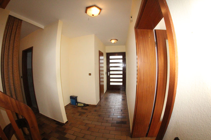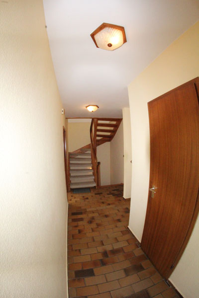 Nach dem Betreten des Hauses über den Haupteingang (Hausvorderseite; Mahagoni-Haustür) befindet man sich auf dem Flur vom Erdgeschoss. Dieser ist in L-Form ausgerichtet, so dass alle Zimmer einfach und schnell zu erreichen sind. Direkt rechts neben dem Eingang befindet sich ein separates Gäste-WC. Links daneben - im weiteren Flurverlauf - ist eine Geraderobe anzufinden, die über einen Wandvorsatz definiert wird. Vom Flur aus sind auf der linken Seite die Küche und eine Essdiele anzufinden. Das Betreten der Küche ist nur über die Essdiele möglich. Weiter gelangt man von der Essdiele durch einen offenen Rundbogen ins große Wohnzimmer.
