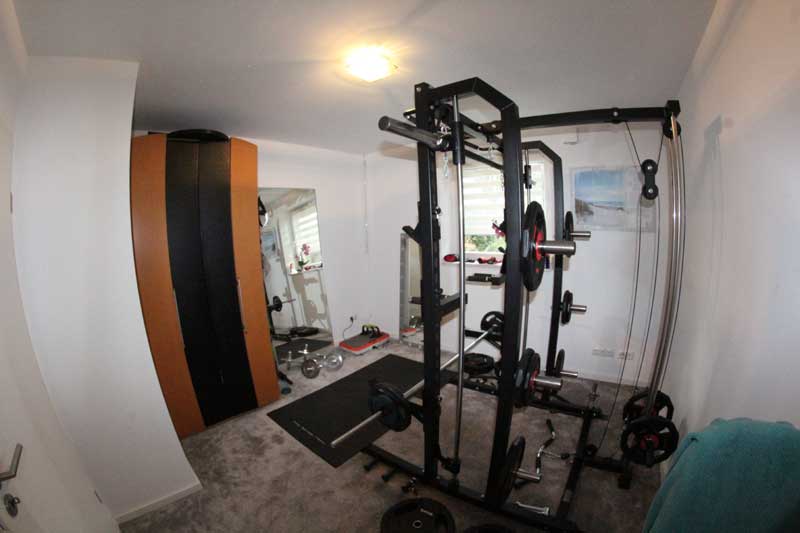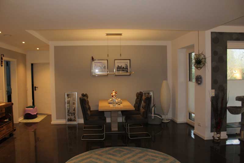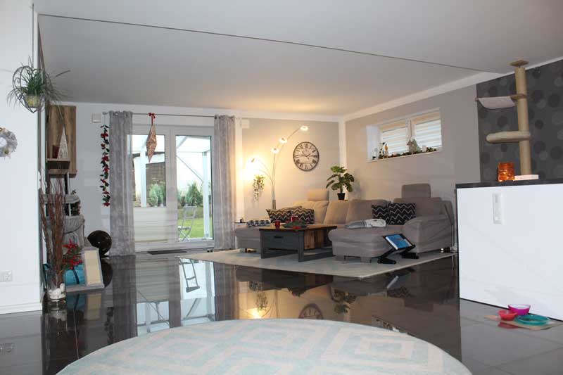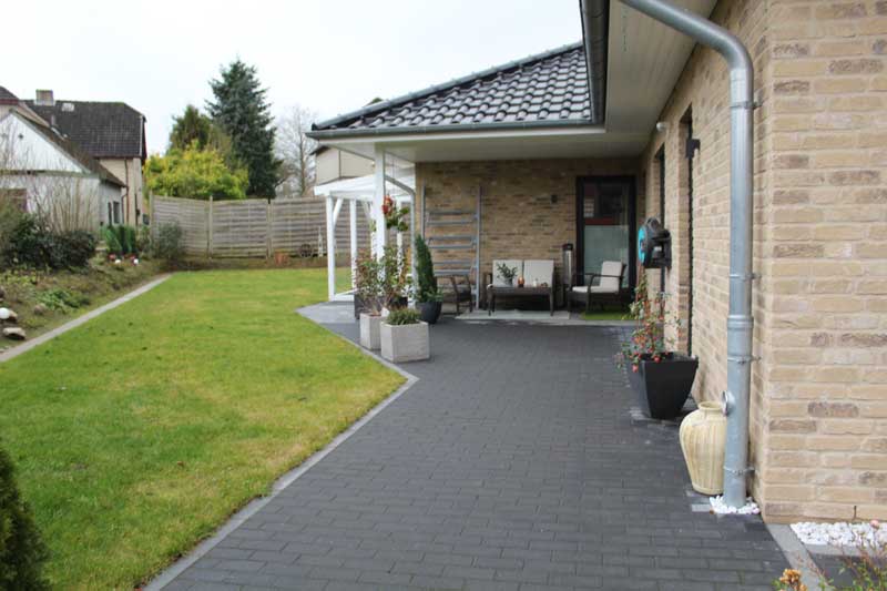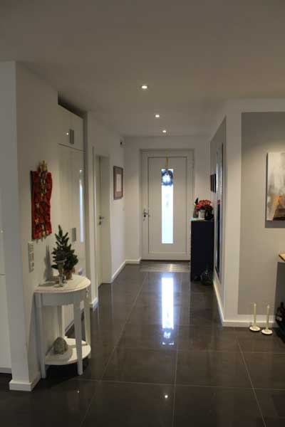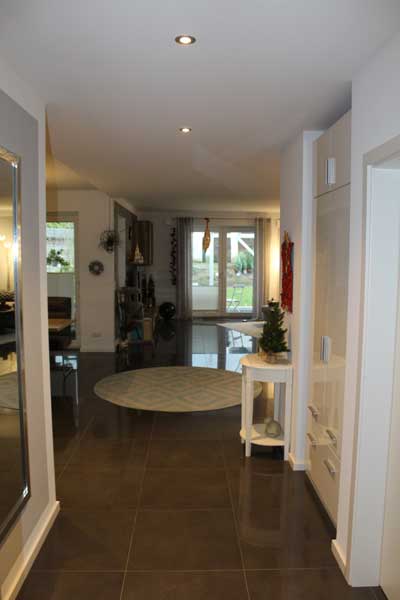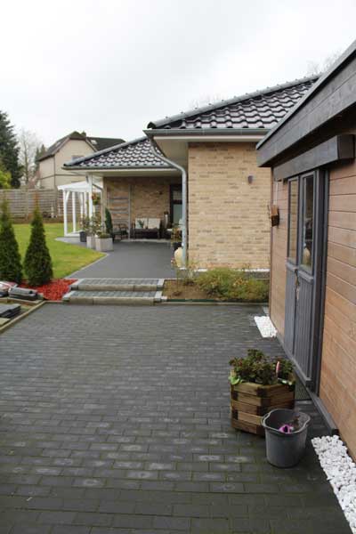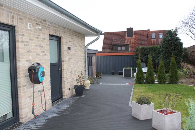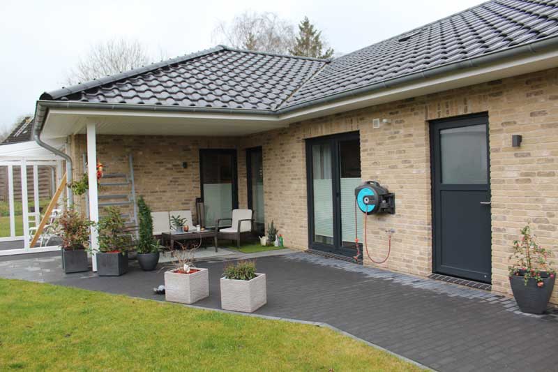 Aufgrund der optimalen Raumaufteilung sind alle Räume einfach und bequem zu erreichen. Aber nicht nur die Räume, sondern auch die integrierte Garage, in der sich auch der Hauswirtschaftsraum (Technikraum) befindet. Auch die Garage ist gefliest und verfügt – wie auch alle anderen Räume – über eine Fußbodenheizung. Fenster und eine Außentür zur Terrasse (Hausrückseite) sind ebenfalls vorhanden. Das elektrische Garagentor sorgt zudem für bequemes Hinein- und Herausfahren - mehr Garage geht nicht. Auf der Hausrückseite befindet sich dann noch die aufwendig gestaltete Terrasse, die über die komplette Hausbreite verläuft. Im Bereich des Winkels ist sie sogar teilweise überdacht, so dass man vor zu viel Sonnenstrahlung oder Nässe geschützt ist.