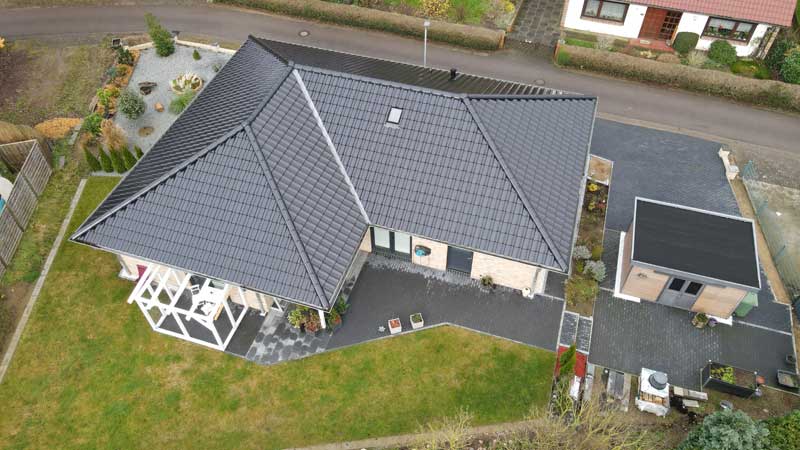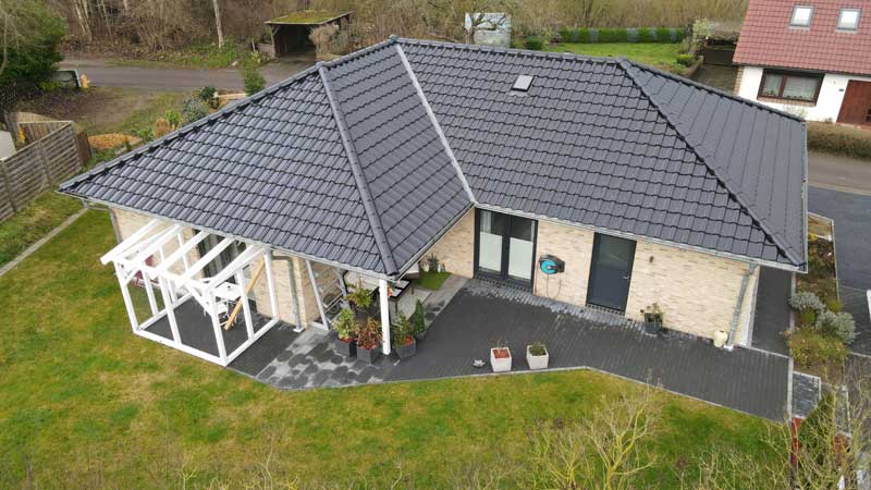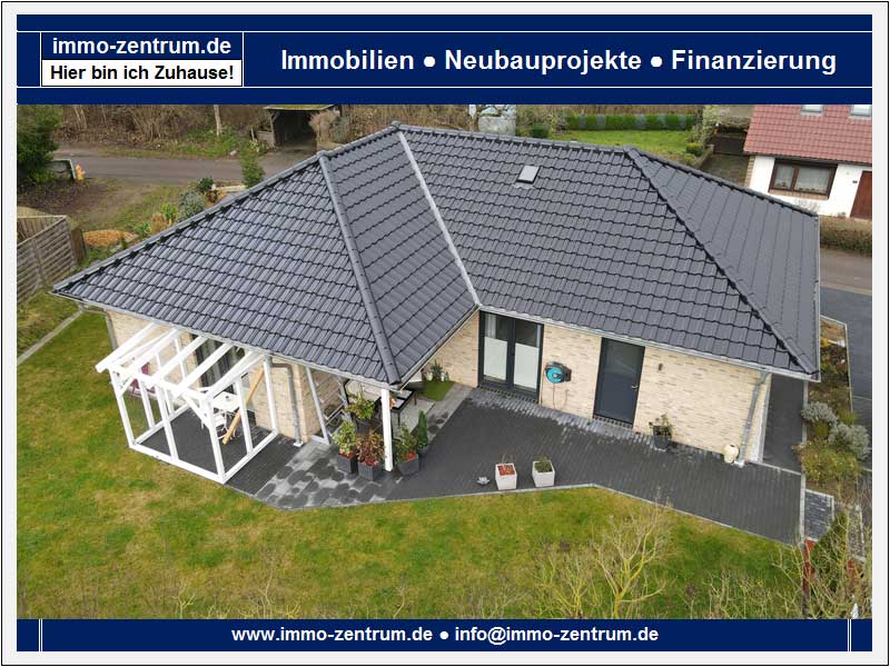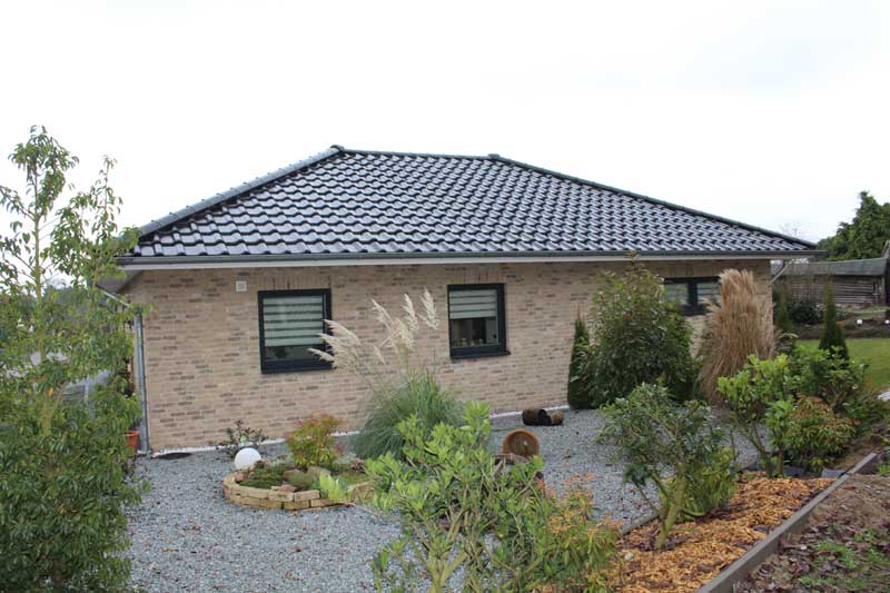 Verkauft werden soll ein ebenerdiger und neuwertiger Winkelbungalow, der 2017 in massiver Bauweise errichtet wurde und die Vorgaben eines KfW-Effizienzhauses 55 erfüllt. Das Haus steht auf einem 672 m² großen Grundstück und liegt in einer ruhigen Wohngegend. Ausgestattet ist der Bungalow mit einem Walmdach auf dem sich Tondachziegel befinden. Aufgestellt wurde das Haus auf einer Klimabodenplatte, die sowohl Kälte und Nässe fernhält und gleichzeitig auch für eine brückenfreie Wärmeverteilung sorgt. Dies führt zu einer erheblichen Senkung der Heizkosten.