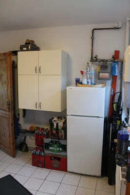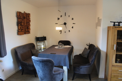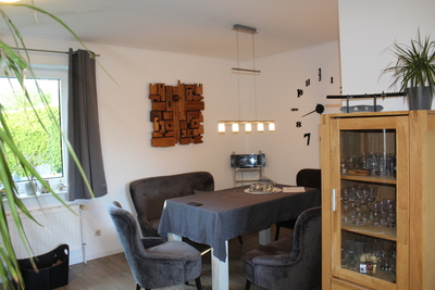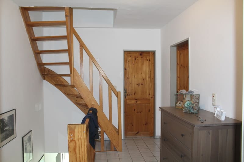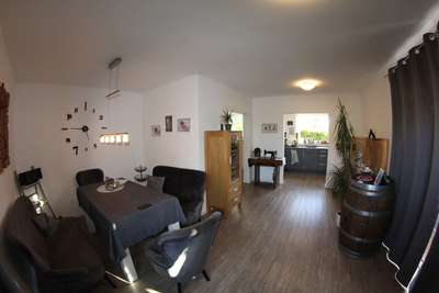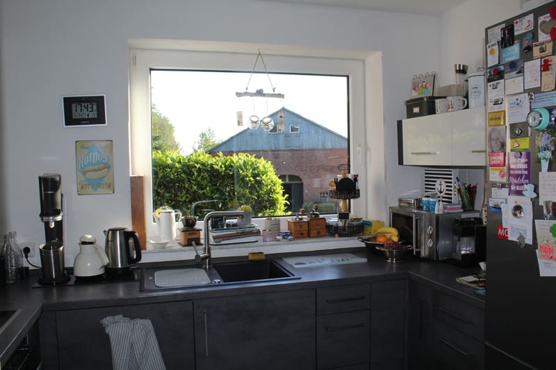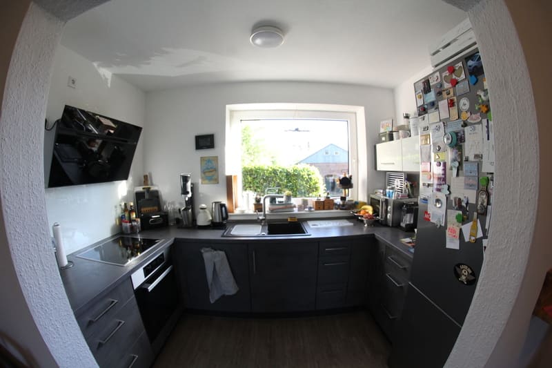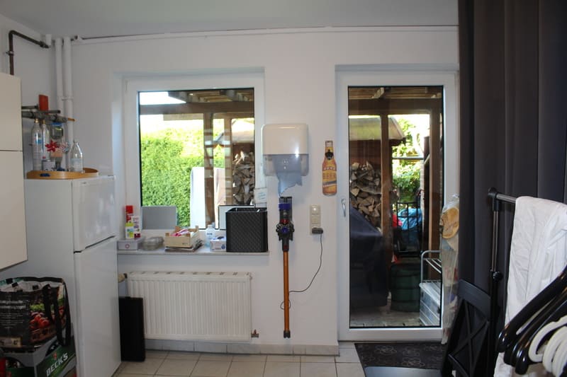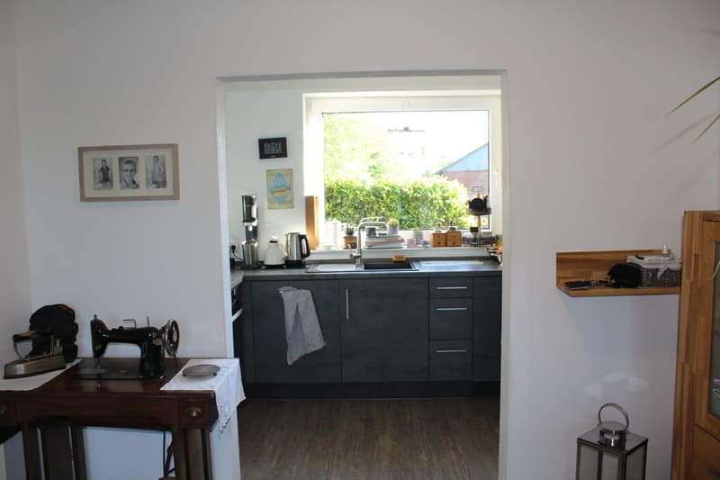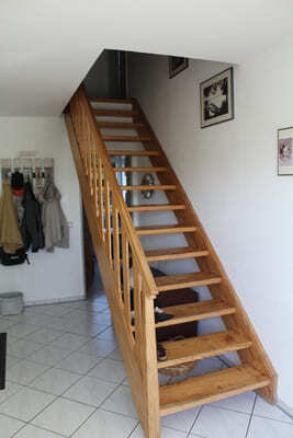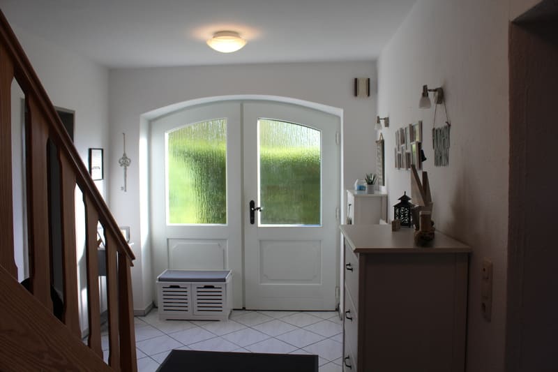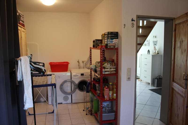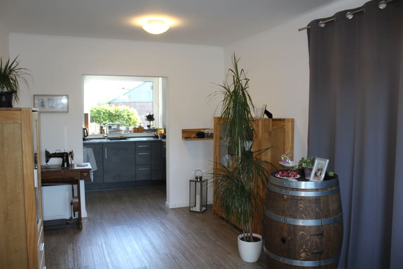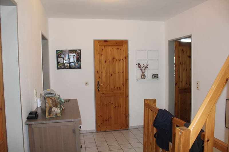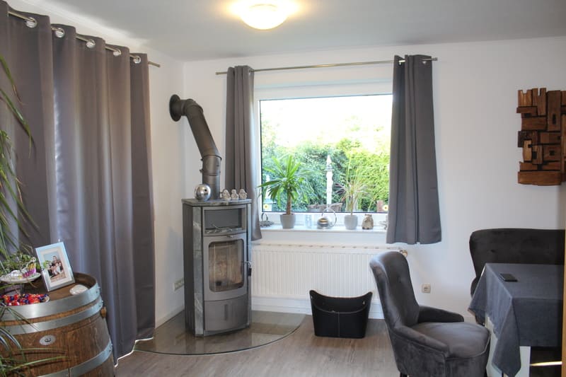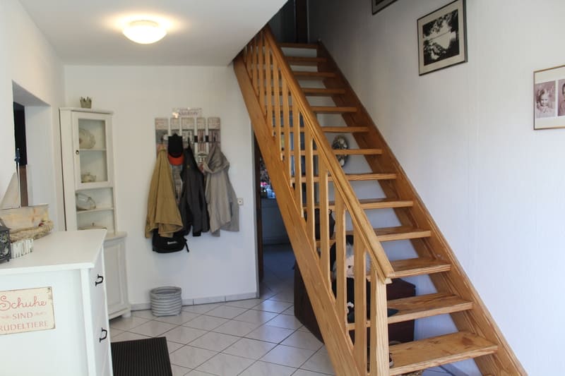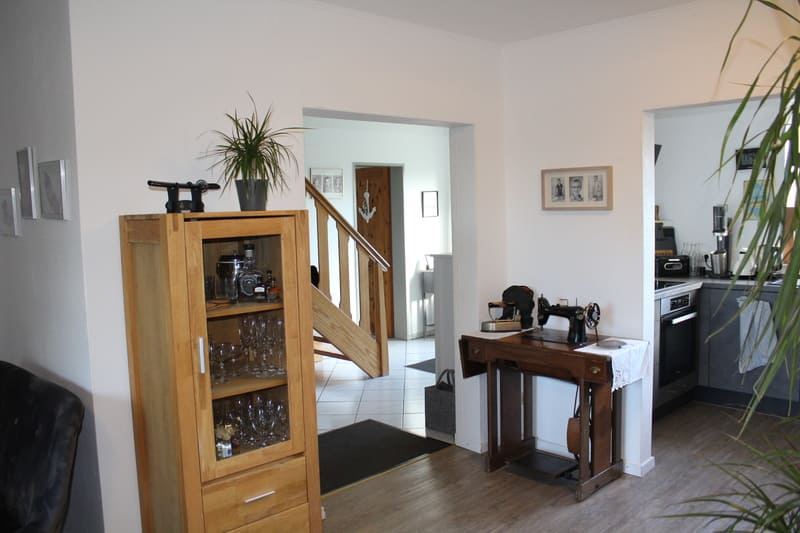 Auf der Hausvorderseite gelangt man über eine massive Treppe zum Hauseingangsbereich. Im Haus angekommen befindet sich auf einem großen Flur (Diele), von dem alle Räume im Erdgeschoss schnell erreicht sind. Neben dem Hauseingangsbereich befindet sich auf der rechten Seite ein Gäste-WC. Da dieses aber recht groß ist, wurde zusätzliche eine Dusche installiert. Angrenzend ans Gäste-WC ist auf der rechten Hausseite der Hauswirtschafts- und Abstellraum anzufinden. In diesem recht großen Raum können problemlos Waschmaschine, Trockner, Kühlschrank und weitere Utensilien untergebracht werden. Hier ebenfalls anzufinden sind die Elektrik und der Telefonanschluss. Über den Hauswirtschaftsraum hat man auch einen direkten Zugang in den Garten. Auf der linken Hausseite sind im Erdgeschoss dann noch der offene Koch-, Ess- und Wohnbereich anzufinden. Der Kochbereich verfügt über eine moderne und neuwertige Einbauküche, die in U-Form installiert wurde. Im Wohn- und Essbereich sind eine Terrassentür und ein Kaminofen anzufinden.