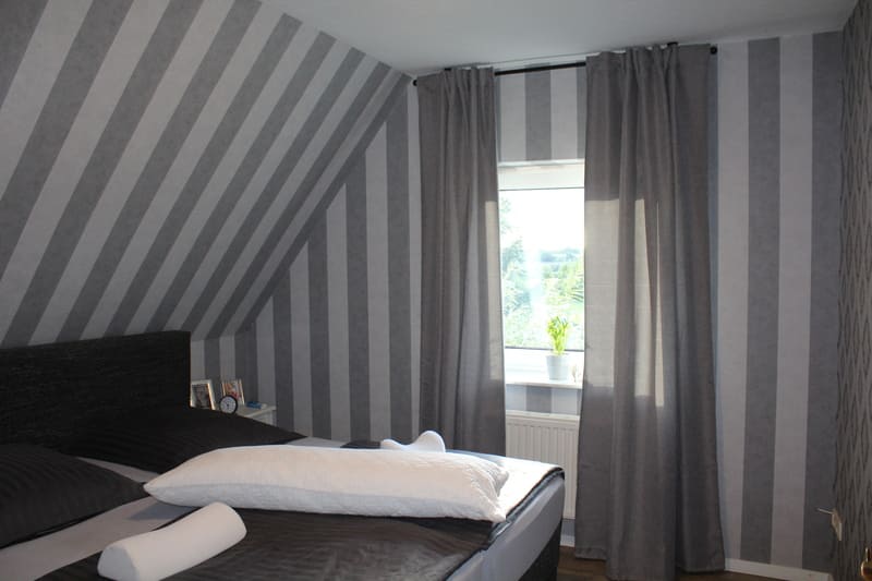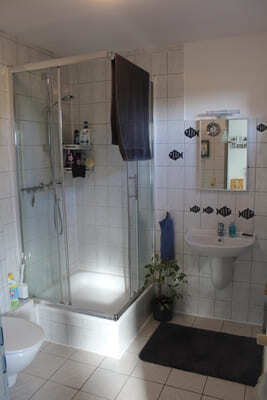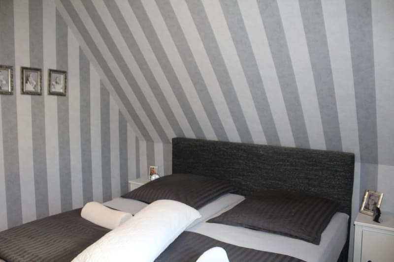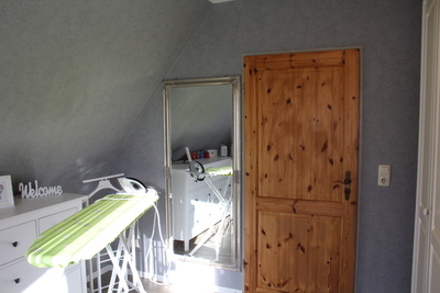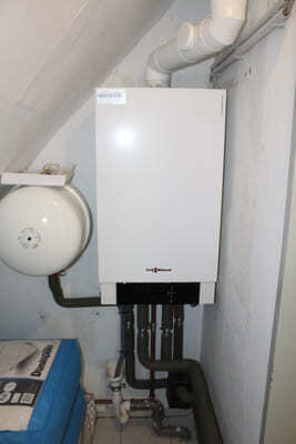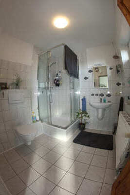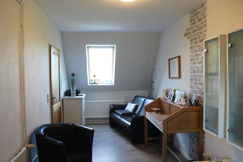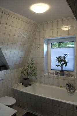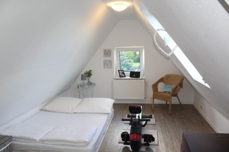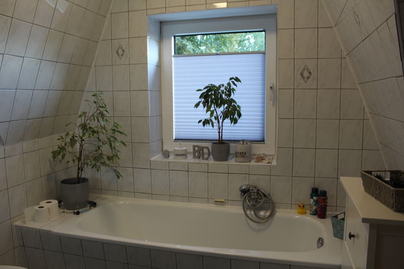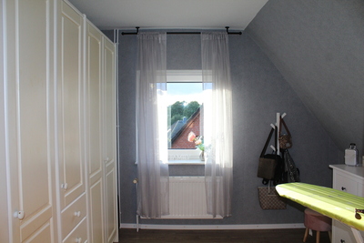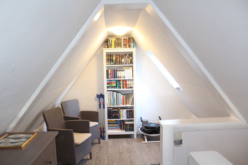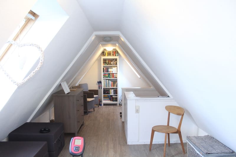 Über eine Holztreppe gelangt man von der Diele ins Dachgeschoss. Oben angekommen befindet man sich auf dem Flur. An den jeweiligen Kopfenden des Flures befinden sich einmal ein Abstellraum und zur Hausvorderseite das Badezimmer. Im Abstellraum ist die Gaszentralheizung (Brennwerttechnik) mit Warmwasseraufbereitung aus dem Jahr 2020 von Viessmann untergebracht. Das moderne Badezimmer befindet sich im Bereich des Friesengiebels und hat daher wenig Dachschrägen aufzuweisen. Es ist raumhoch gefliest, verfügt über eine Badewanne und einen großen Waschplatz. Auf der rechten Seite im Dachgeschoss befindet sich ein Schlafzimmer, welches aktuell als Wohnzimmer genutzt wird. Auf der linken Seite sind dann noch zwei weitere Zimmer anzufinden, die wahlweise als Schlaf-, Kinder-, oder Arbeitszimmer genutzt werden können. Eine Nutzung als Gästezimmer ist natürlich ebenfalls möglich.
