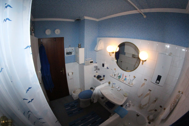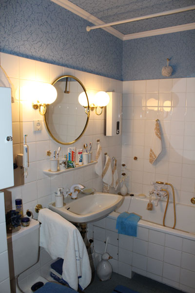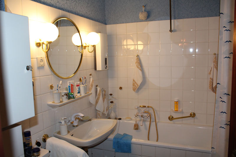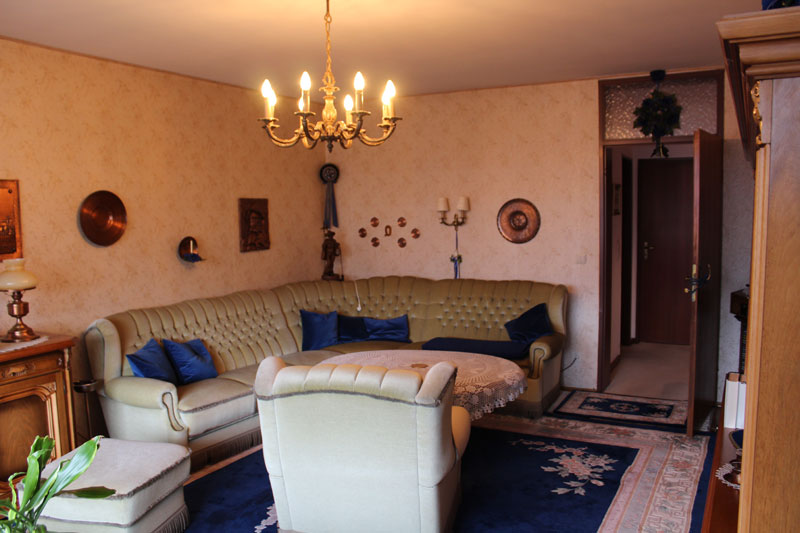 Auf der linken Wohnungsseite befinden sich unmittelbar neben der Wohnungseingangstür ein klassisches Gäste-WC, über einen kleinen Durchgangsflur gelangt man vom Flur in ein weiteres Zimmer, welches beispielsweise als Ess-, Kinder- oder Arbeitszimmer genutzt werden könnte. Rechts daneben liegt dann noch das Wohnzimmer. Das Wohnzimmer ist mit einem großen Fenster (spendet viel Licht) und einer Terrassentür ausgestattet. Über die Terrassentür gelangt man auf die Loggia. Die gemütliche Loggia verfügt über einen Abstellrum und ist beleuchtet (Außenlampe). Ferner st eine elektrische Markise installiert, die vor zu viel Sonnenstrahlung schützt. Da die benachbarten Wohneinheiten versetzt errichtet wurden, ist die Loggia vor Blicken geschützt, was für viel Gemütlichkeit sorgt. Am Stirnende des Flures ist zu guter Letzt dann noch das Badezimmer anzufinden, welches mit einer Badwannen-Duschkombination ausgestattet ist.