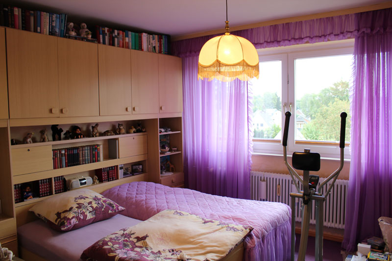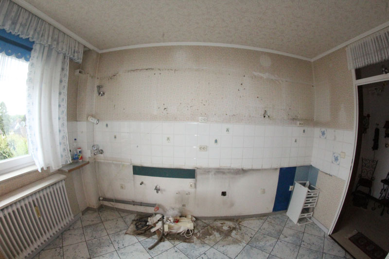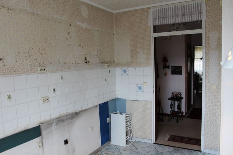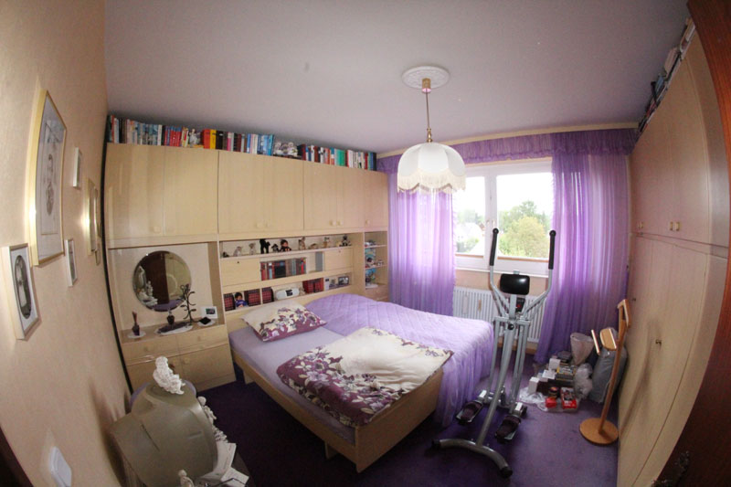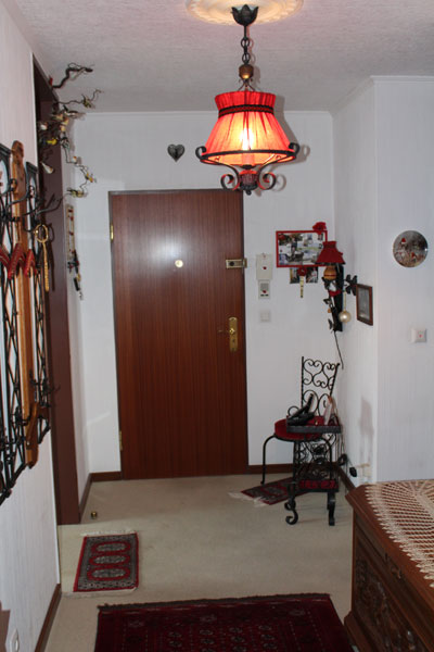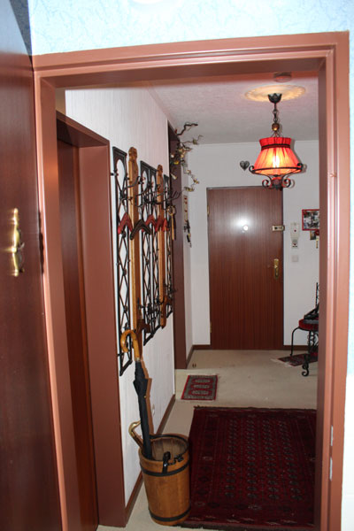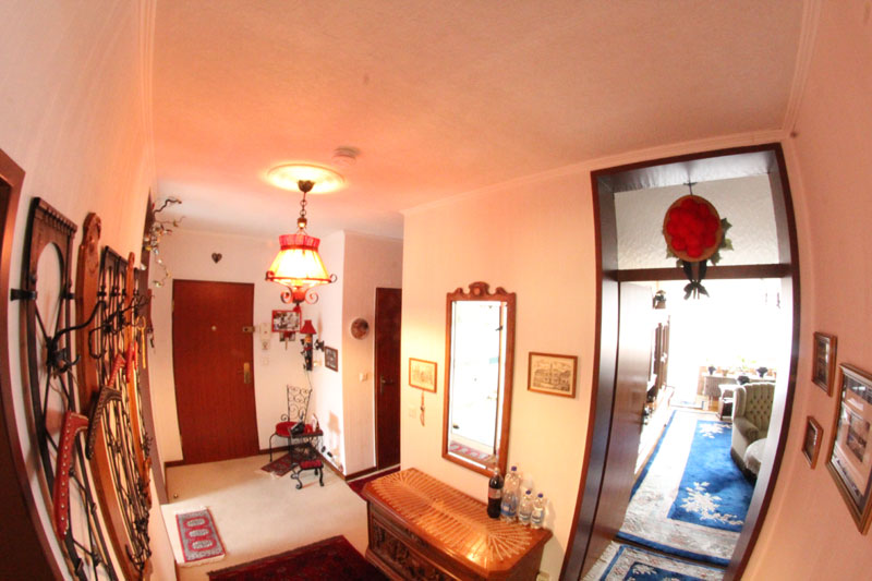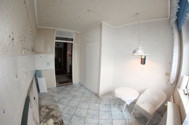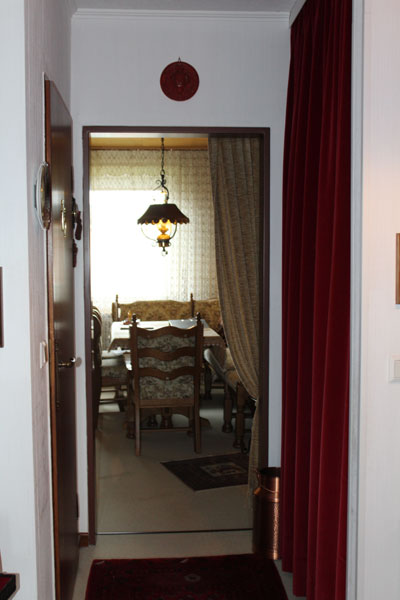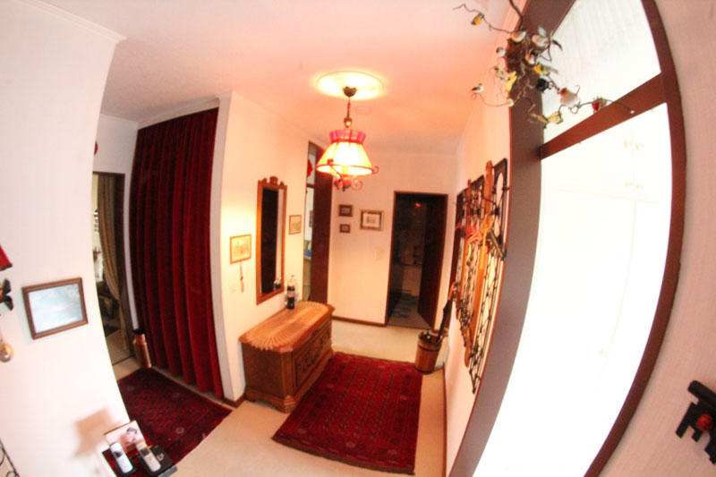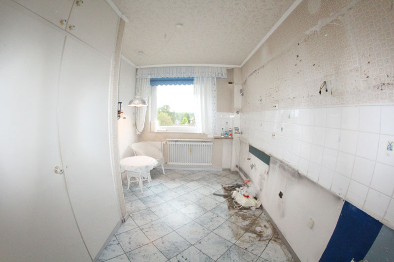 Wie bereits angesprochen besteht die Wohnung selbst aus 3 Zimmern plus Küche, Bad und Gäste-WC. Über das gepflegte und helle Treppenhaus gelangt man in die Wohnung. Erwähnt werden sollte noch, dass sich auf jeder Seite vom Treppenhaus 4 Wohnungen befinden, sodass es auf jeder Geschossebene jeweils nur zwei Wohnungseingänge gibt. Nach dem Betreten der Wohnung befindet sich auf der rechten Seite die Küche. Eine Einbauküche ist aktuell nicht vorhanden und muss noch angeschafft werden. Neben der Küche befindet sich das Elternschlafzimmer. Der Flur hat eine optimale Größe und ermöglicht einen leichten Zugang zu allen Räumen.