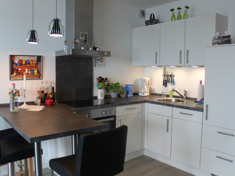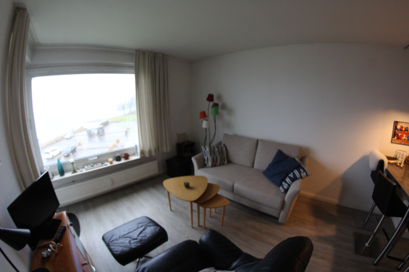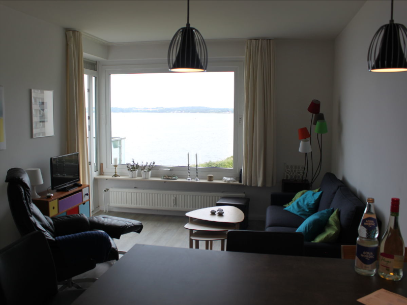 Zur Wohnung selbst gehört ein geräumiger Wohn- und Essbereich, ein Badezimmer, ein Schlafzimmer und eine Loggia mit atemberaubenden Meerblick über die Flensburger Förde (Ostsee). Wobei alle Räume, bis auf das Badezimmer (hier Fliesen), mit Laminat ausgestattet sind. Nach dem Betreten der Wohnung befindet man sich im Wohn- und Essbereich. Von dort aus sind alle Räume einfach zu erreichen und eine große Fensterfront sorgt für viel helles und natürliches Licht. Die vorhandene Einbauküche bietet für jeden Hobbykoch genügend Platz und ausreichende Möglichkeiten Küchenutensilien zu verstauen. Die Küche bietet einen fließenden Übergang zum Wohnbereich, wo Sitzgelegenheiten mit Meerblick jeden Abend für Urlaubsstimmung sorgen.