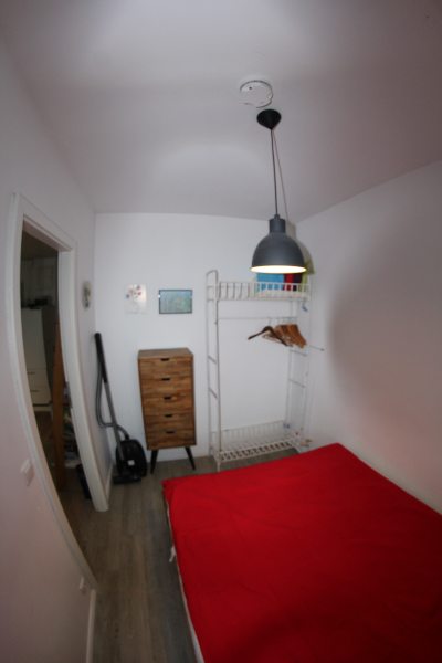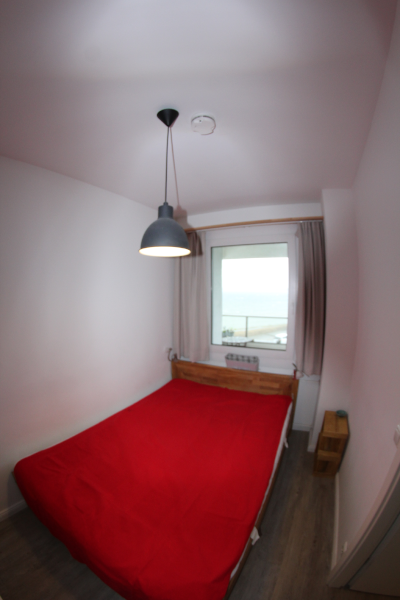 Das Schlafzimmer bietet ausreichend Platz für ein Doppeltbett und einen offenen Kleiderschrank. Auffällig ist auch hier die helle Atmosphäre durch ein großes Fenster mit Blick nach draußen, wobei man bei offenem Fenster die Wellen zum Einschlafen hören kann.