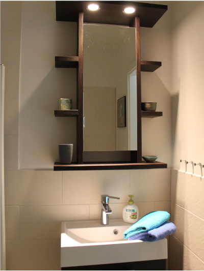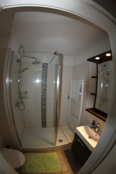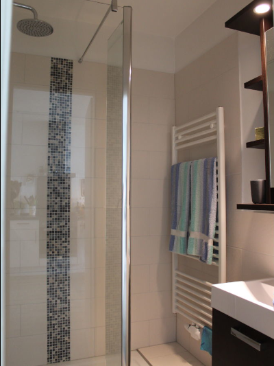 Auf der linken Wohnungsseite befindet sich der Eingang in das Badezimmer. Das Badezimmer ist im Zuge einer Modernisierung auf den neuesten Stand gebracht worden und bietet mit einer fast bodenebenen Dusche und knapp deckenhohen Fliesen einen modernen Eindruck.