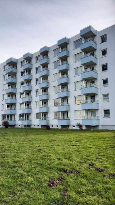 Verkauft werden soll eine Eigentumswohnung, welche sich in schöner und ruhiger Lage von Glücksburg befindet. Der Gebäudekomplex wurde 1974 in massiver Bauweise errichtet und befindet sich, mit insgesamt 63 Wohnungen, auf einem 7.437 m² großen Grundstück. Das Wohngebäude ist mit einem Flachdach ausgestattet. Zu der Wohnung gehört ein leicht zugänglicher und abschließbarer Kelleranteil. Zusätzlich sind viele Parkplätze direkt vor dem Gebäude vorhanden, welche für alle Bewohner und Besucher ausreichende Parkmöglichkeiten bieten. Die Wohnung kann über ein gepflegtes, großes und helles Treppenhaus oder mithilfe eines Fahrstuhls, mit Sitzmöglichkeit, erreicht werden.