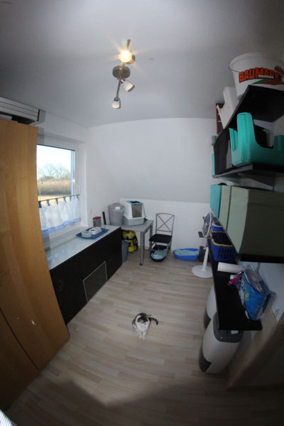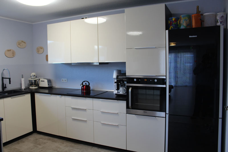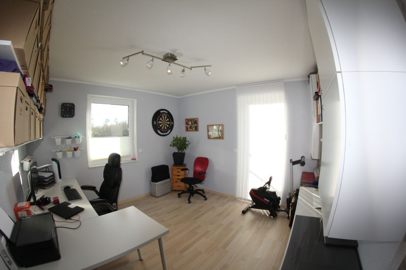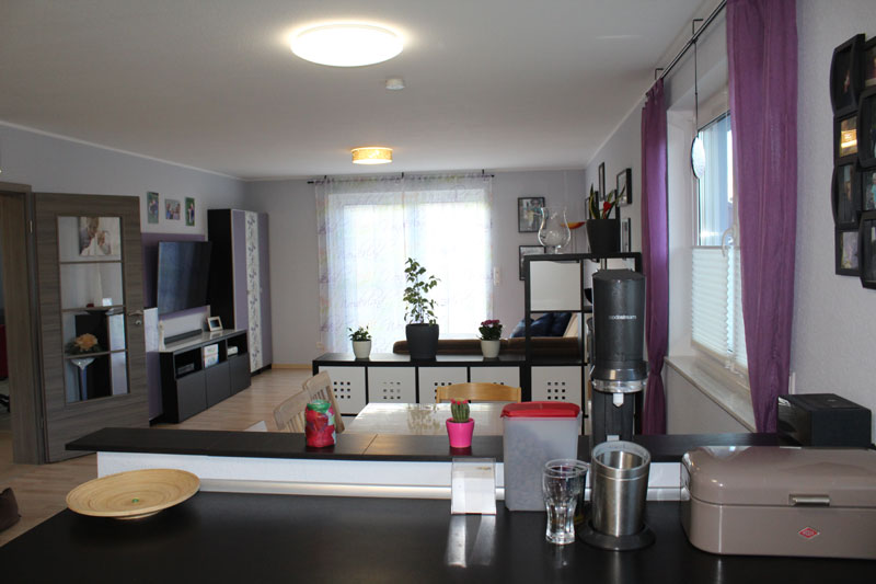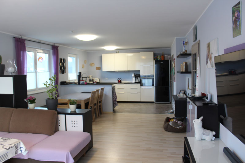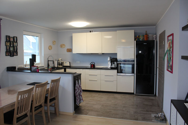 Der Kochbereich ist mit einer u-förmigen, modernen und sehr gepflegten Einbauküche ausgestattet. Der große Wohn- und Essbereich mit über 30 m² bietet genügend Platz für die ganze Familie. Neben der Küche befindet sich der Hauswirtschaftsraum, der auch über die zusätzliche Außentür erreichbar ist. Im Hauswirtschaftsraum (HWR) werden auch die Vorräte gelagert, die so auf kurzem Weg in die Küche zur Verarbeitung gelangen. Weiter befindet sich im HWR auch die Gaszentralheizung und der 300 Liter große Warmwasserspeicher, dessen Wasser über eine Solaranlage (Die Solarkollektoren befinden sich auf dem Dach) der Firma Junkers aufgeheizt wird. Wer im Haus nach Heizkörpern sucht wird enttäuscht – im kompletten Haus ist nämlich eine Fußbodenheizung installiert. Das Haus erfüllt die Anforderungen eines KfW 70-Effizienzhauses entsprechend den Vorgaben der EnEV 2009.