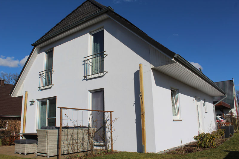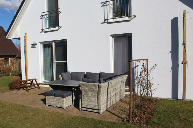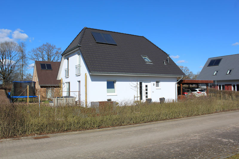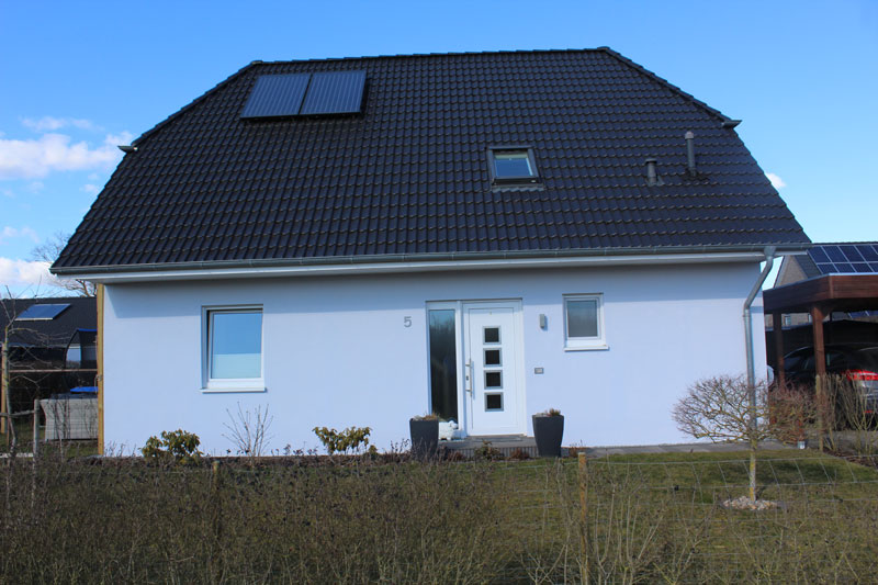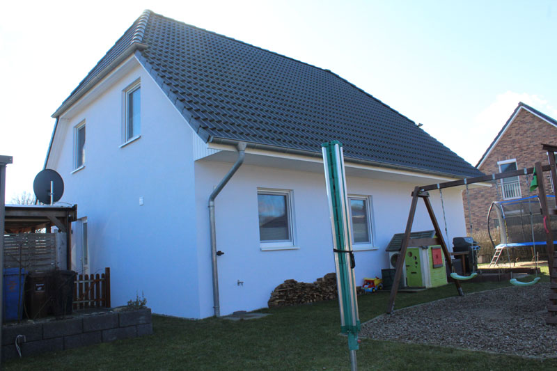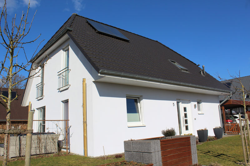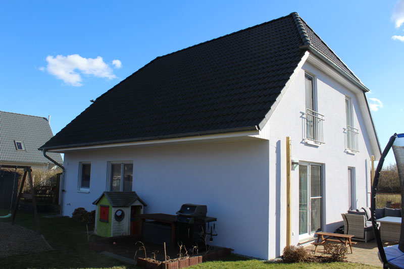 Eine kleine Terrasse befindet sich auf der Hausrückseite und eine größere am westlichen Hausgiebel, so dass man an schönen Tagen die Sonne bis in die Abendstunden genießen kann. Ein einfach aufbaubares Sonnensegel schützt dabei vor zu viel Sonnenstrahlung. Über eine Terrassentür gelangt man schnell ins Haus, um kühle Getränke zu besorgen. Das Dach ist mit einem Krüppelwalmdach ausgestattet und mit Pfannen der Firma Braas eingedeckt. Die elektrischen Außenrollladen sind ganz einfach über eine App steuerbar.