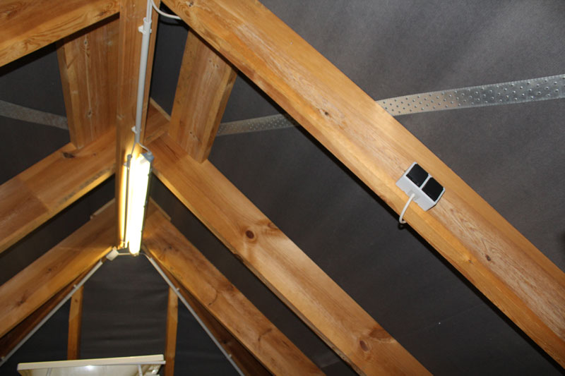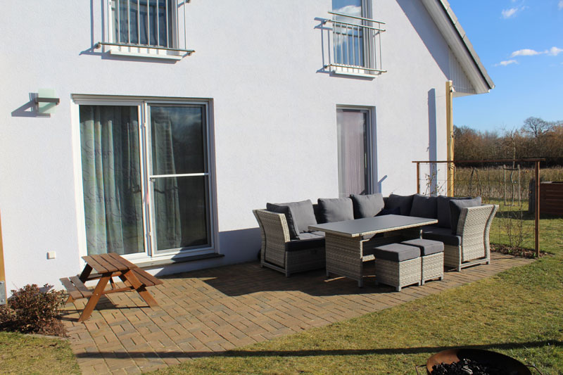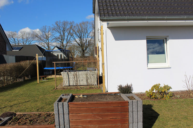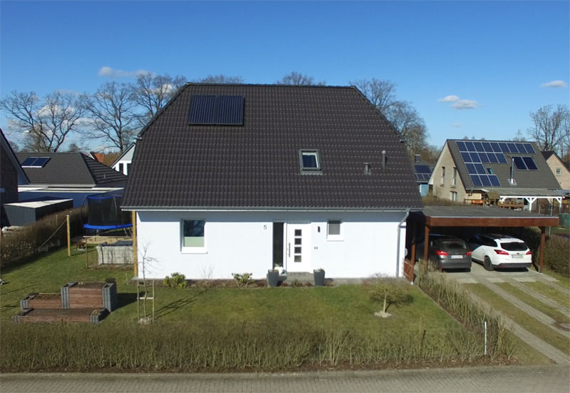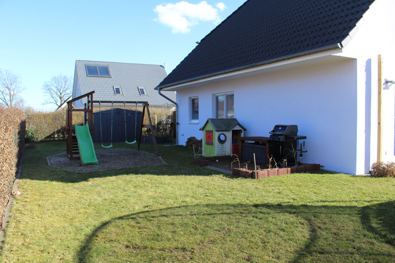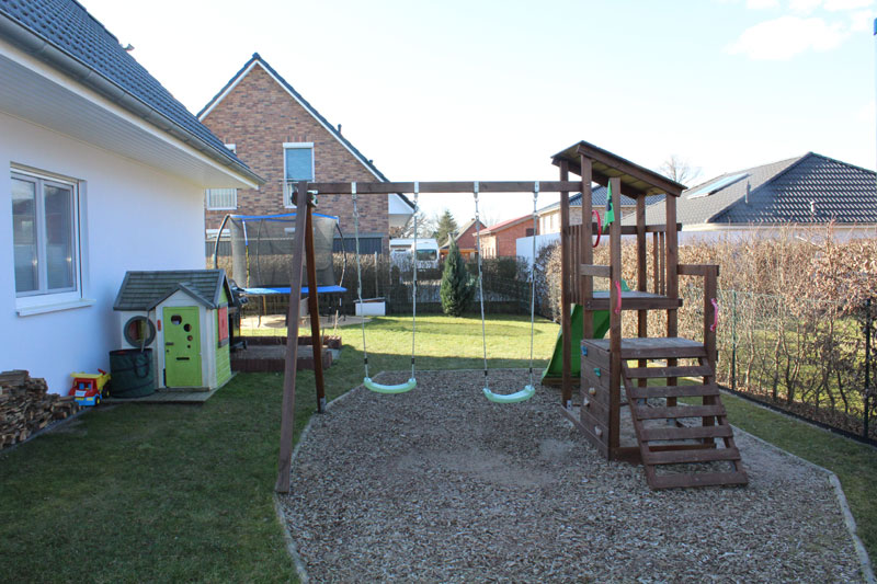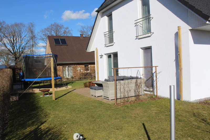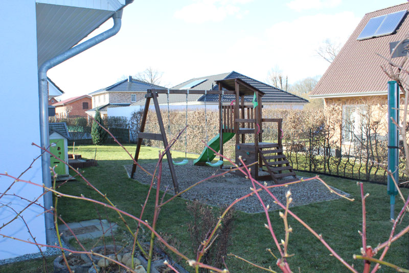 Eine kleine Terrasse befindet sich auf der Hausrückseite und eine größere am westlichen Hausgiebel, so dass man an schönen Tagen die Sonne bis in die Abendstunden genießen kann. Ein einfach aufbaubares Sonnensegel schützt dabei vor zu viel Sonnenstrahlung. Über eine Terrassentür gelangt man schnell ins Haus, um kühle Getränke zu besorgen. Das Dach ist mit einem Krüppelwalmdach ausgestattet und mit Pfannen der Firma Braas eingedeckt. Die elektrischen Außenrollladen sind ganz einfach über eine App steuerbar.