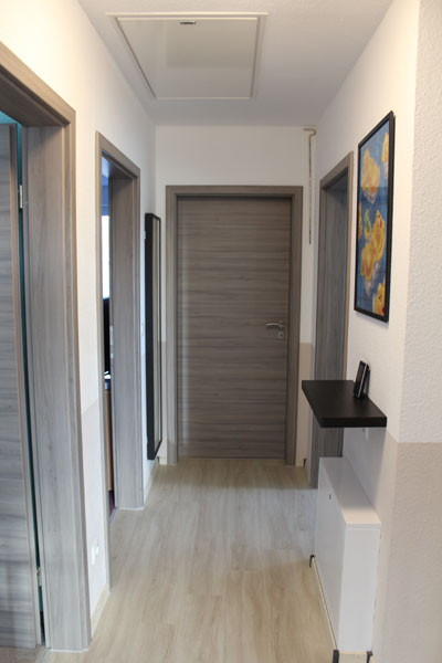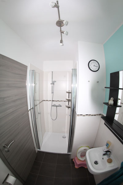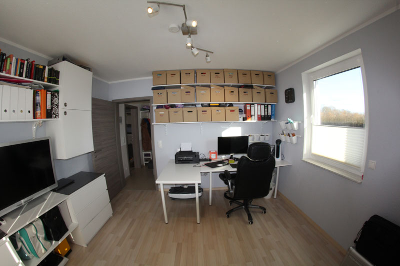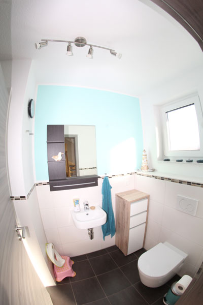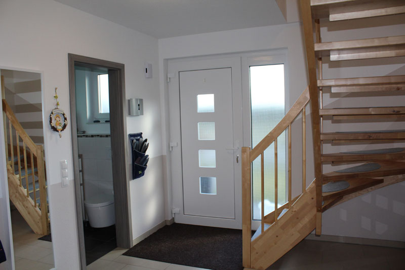 Über die Hauseingangstür gelangt man auf den Flur (Diele) des Erdgeschosses. Von dort sind dann alle Räume, bis auf den Hauswirtschaftsraum schnell erreichbar. Direkt neben dem Hauseingang befindet sich das Gäste-WC, welches zusätzlich mit einer bodentiefen Dusch ausgestattet wurde. Ein weiteres Zimmer befindet sich auf der gegenüberliegenden Seite, welches beispielsweise als Arbeits- oder Gästezimmer genutzt werden könnte. Dieses Zimmer beinhaltet ein bodentiefes Fensterelement, so dass genügend Tageslicht hineinströmt. Bei einer Familie mit mehr als zwei Kindern, könnte es natürlich auch als weiteres Kinderzimmer dienen. Weiter befindet sich im Erdgeschoss noch die offene Wohnküche (offener Wohn-, Ess- und Kochbereich).