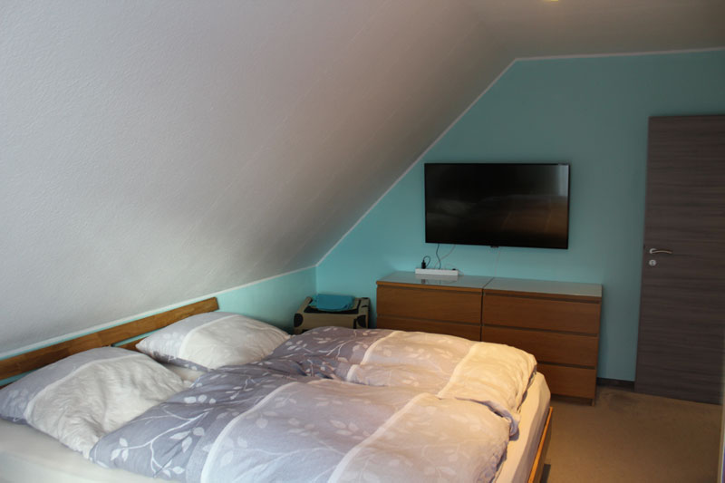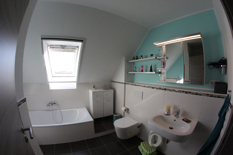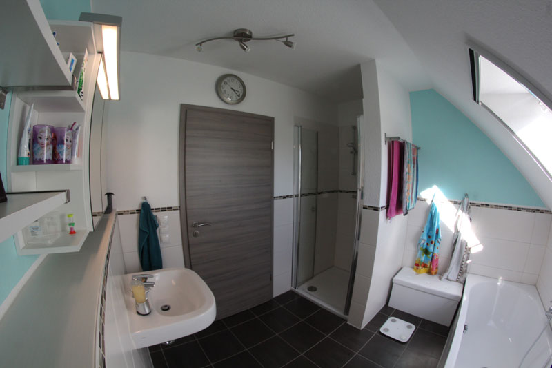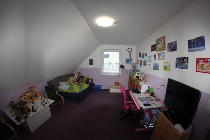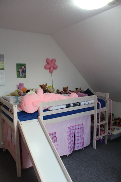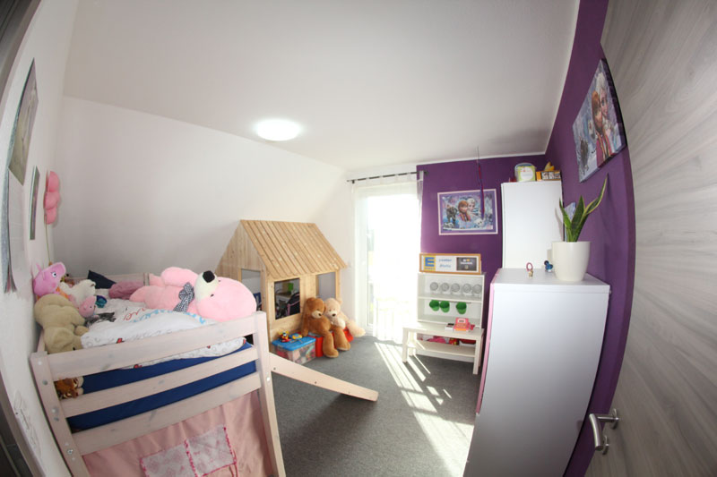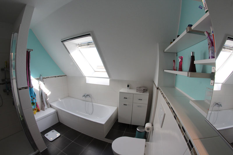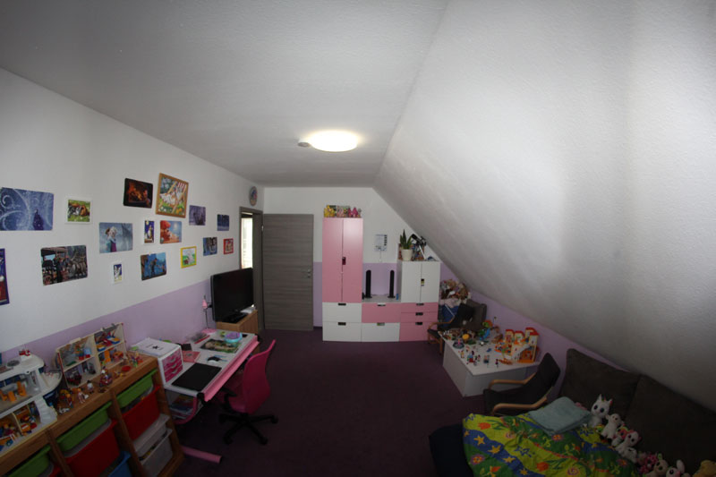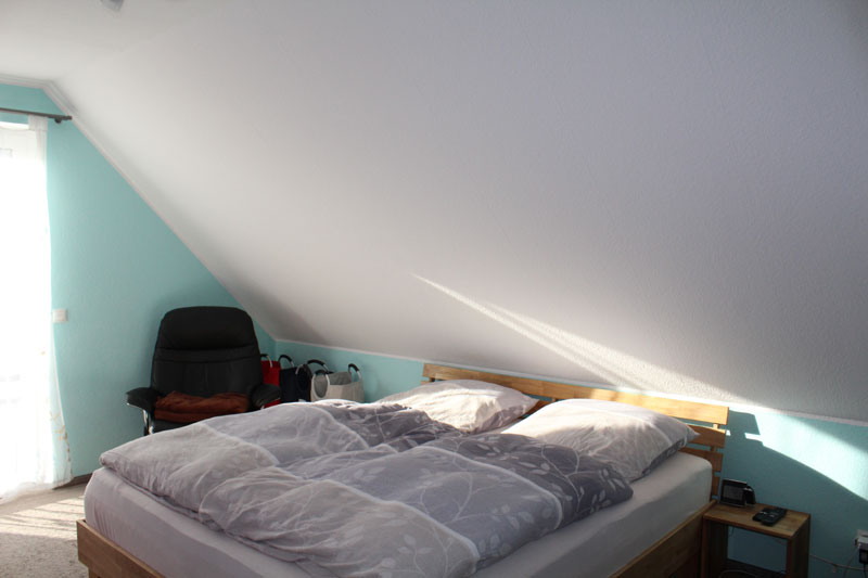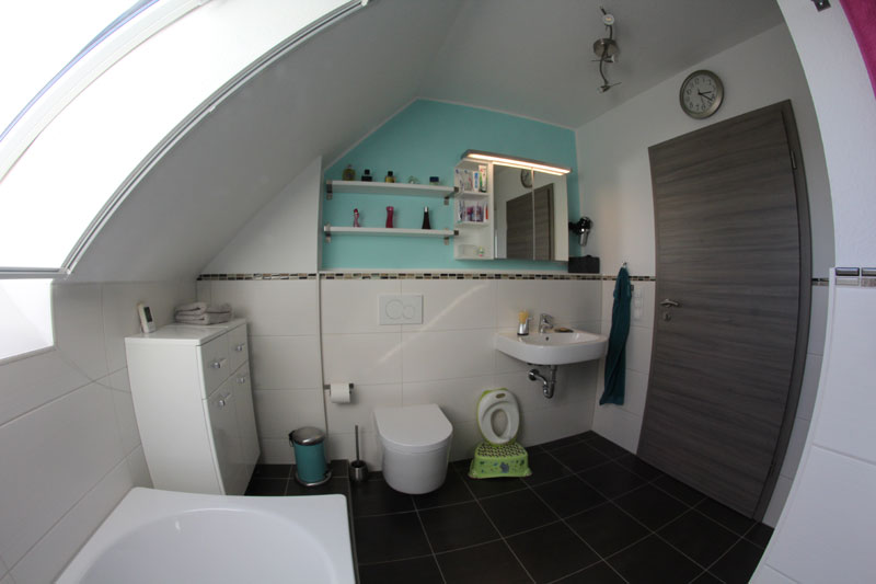 Über eine Holztreppe in L-Form gelangt man vom Erdgeschoss ins Dachgeschoss. Im Dachgeschoss befinden sich ein Flur, vier Zimmer und das Badezimmer. Alle vier Zimmer, sowie auch das Badezimmer sind vom Flur optimal zu erreichen. Festgehalten werden muss jedoch, dass eines der vier Zimmer etwas kleiner ausfällt und eine Größe unter 10 m² hat. Daher könnte dieses Zimmer beispielsweise auch als Arbeits- oder Gästezimmer dienen. Nutzbar ist es natürlich auch als Kinderzimmer. Die anderen drei Zimmer sind recht großzügig gestaltet und können daher beliebig, als Schlaf- oder Kinderzimmer genutzt werden. Im Vollbad sind eine Badewanne und eine bodentiefe Dusche installiert.