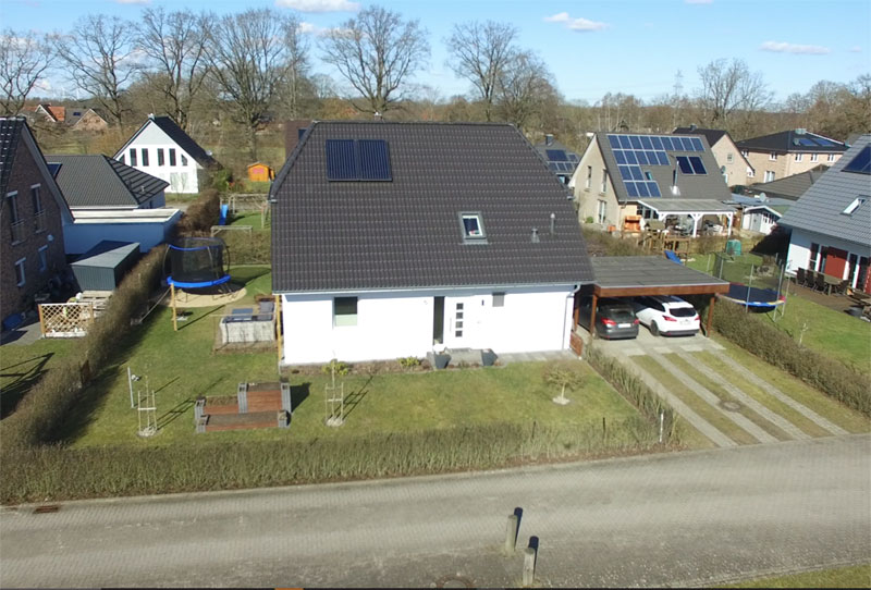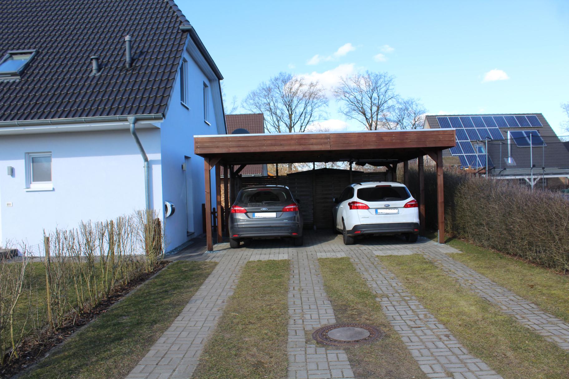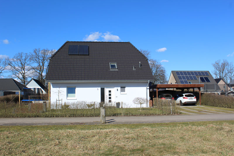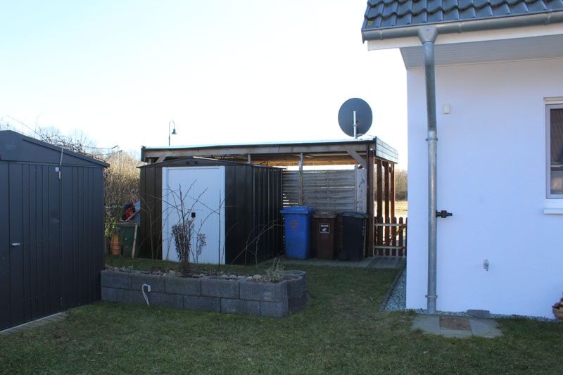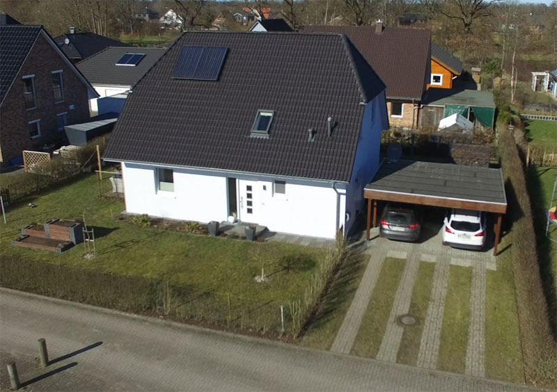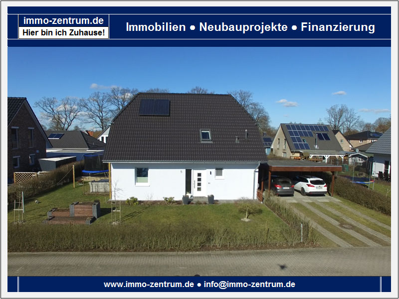 Verkauft werden soll ein Einfamilienhaus in massiver Bauweise. Das Haus wurde 2014 errichtet und steht auf einem 586 m² großen Grundstück in einer ruhigen Wohnlage in Bimöhlen. Zum Haus gehören zwei Terrassen, zwei Abstellschuppen und ein Doppel-Carport. Eine große Auffahrt bietet zudem noch Platz für ca. vier weitere Autos (Kfz-Stellplätze). Vom Carport gelangt man über eine separate Außentür direkt in den Hauswirtschaftsraum, wo der Einkauf in diversen Regalen und Abstellflächen schnell verstaut werden kann. Dies hat den Vorteil, dass man selbst an windigen oder nassen Tagen, den Einkauf schnell und trocken ins Haus bringen kann.