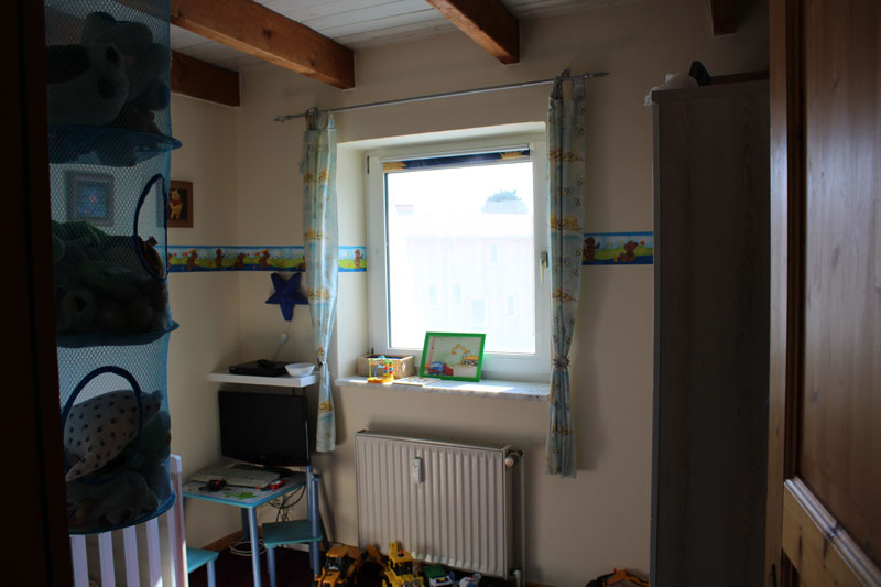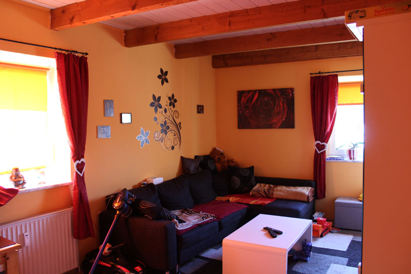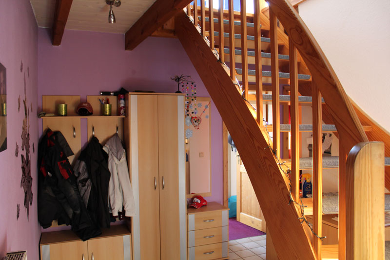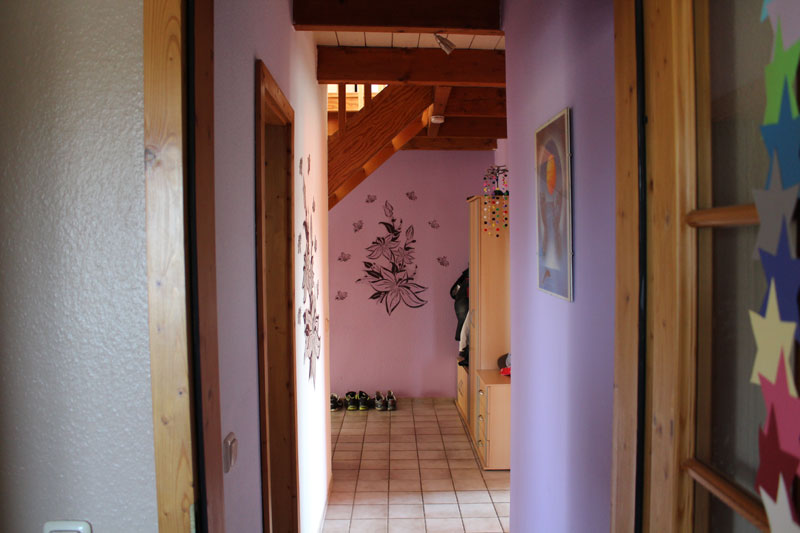 Über ein modernes Treppenhaus (Wird nur von zwei Wohnungen benutzt) kommt man in die Wohnung, welche sich im Obergeschoss des Mehrfamilienhauses befindet. In der Wohnung angekommen, befindet man sich im Eingangsbereich auf dem in L-Form gestalteten Flur. Neben dem Flur befinden sich zwei Zimmer, eine Küche und ein Badezimmer auf der Etage. Über eine Holztreppe vom Flur aus, gelangt man dann ins ausgebaute Dachgeschoss. Hier befindet sich noch ein großes Zimmer, welches als Schlaf- oder Wohnzimmer genutzt werden kann. Ein großes Dreiecksfenster aus mehreren Elementen spendet viel Licht und sorgt für eine angenehme Wohnatmosphäre.