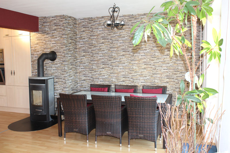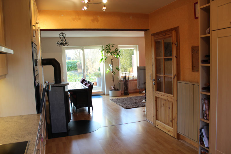Über ein Eingangsvordach gelangt man in das Erdgeschoss. Hier befinden sich neben dem Eingangsflur eine Diele, ein Gäste-WC sowie eine offene Küche mit angrenzendem Ess- und Wohnbereich. Der Wohn- und Essbereich verfügt allein über 29 m² und überzeugt durch eine optimale Raumaufteilung. Die Küche ist modern eingerichtet und kann auf Wunsch übernommen werden. Zwischen der Küche und dem Wohn- und Essbereich befindet sich ein hochwertiger Kaminofen mit Specksteinen, der ebenfalls im Haus bleibt. Das gesamte Erdgeschoss ist durch die vielen Fenster hell und lichtdurchflutet. Vom Wohnzimmer gelangt man über die zweiflügelige Terrassentür auf die Terrasse und in den Garten. Ein kleiner Spielplatz befindet sich direkt hinter dem Garten.
