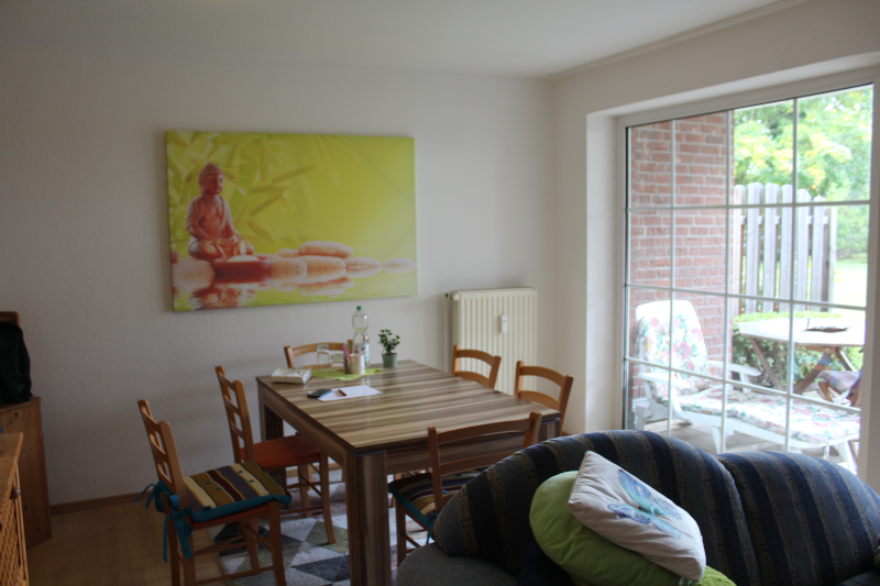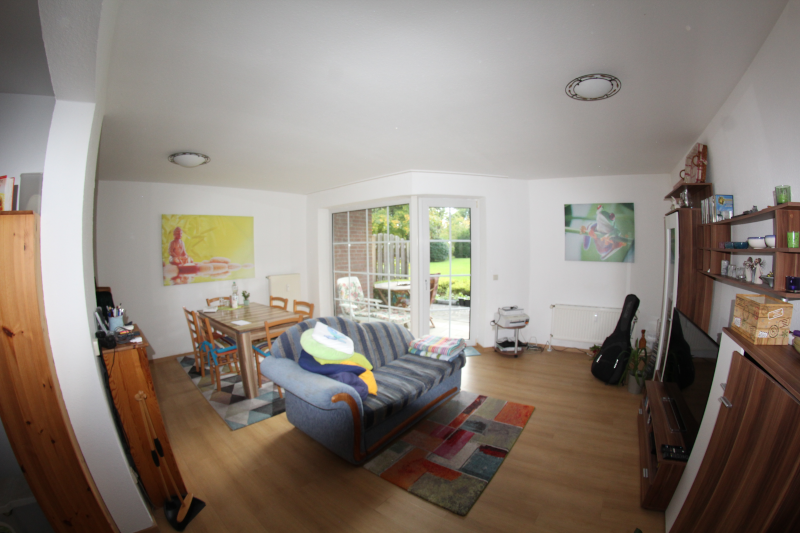 Nach dem Betreten der Wohnung befindet man sich auf dem recht großen Flur. Auf der linken Seite befindet sich die Abstellkammer, in der zahlreiche Utensilien untergebracht werden können. Gegenüberliegend ist das Badezimmer mit Wannen-Duschkombination anzufinden. Auf der rechten Seite des Flures befinden sich die beiden Zimmer, die wahlweise als Schlaf-, Gäste- oder Arbeitszimmer genutzt werden können. Eine klassische Aufteilung wäre Elternschlafzimmer (15,36 m²) und Kinderzimmer. Der Flur verläuft (offener Übergang) dann in den Wohn-, Ess- und Kochbereich, der mit über 22 m² recht großzügig gestaltet wurde. Über die große Fensterfront hat man einen perfekten Blick in den Garten und auf die Terrasse. Die offene Küche befindet sich auf der rechten Seite des Flures. Hier ist eine Einbauküche in L-Form eingebaut, die alle notwendigen Küchengeräte beinhaltet und genügend Platz zum Kochen zur Verfügung stellt. Über eine Terrassentür gelangt man vom Wohn- und Essbereich auf die Terrasse.