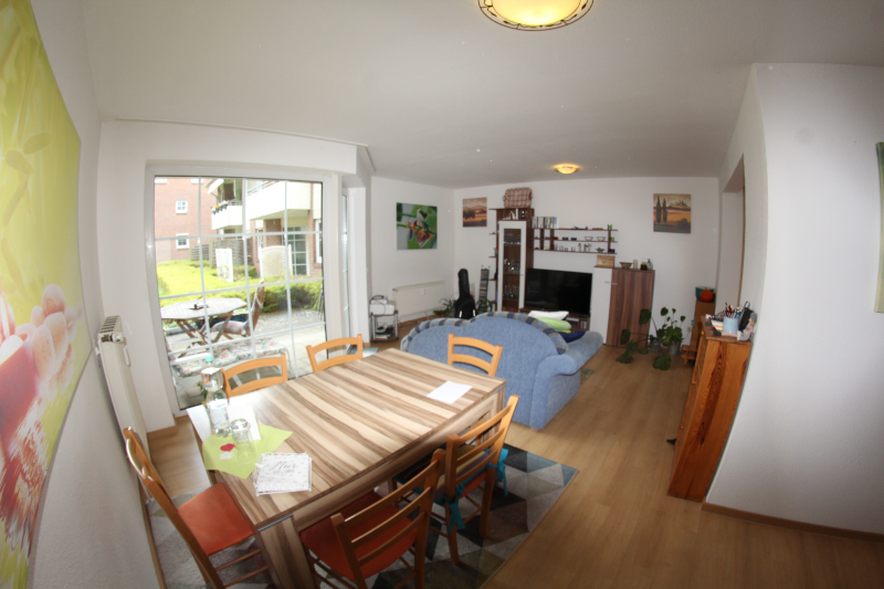 Die im Erdgeschoss liegende Wohnung ist über ein helles und gepflegtes Treppenhaus zu erreichen. Zur 76,97 m² großen Wohnung gehören zwei Zimmer, ein offener Wohn-, Ess- und Kochbereich, ein Flur, ein Badezimmer und ein Abstellraum. Eine teilüberdachte Terrasse (darüberliegender Balkon) vervollständigt das Angebot. Die Terrasse ist über den Wohn- und Essbereich zu erreichen und bietet genügend Platz für gemütliche Grillabende.