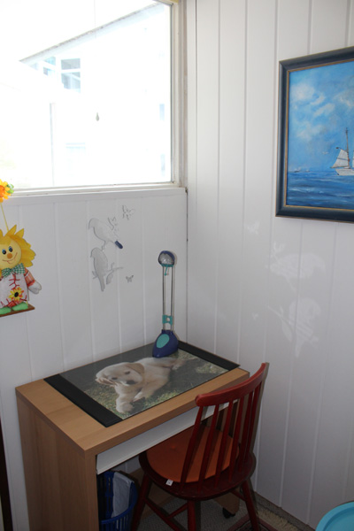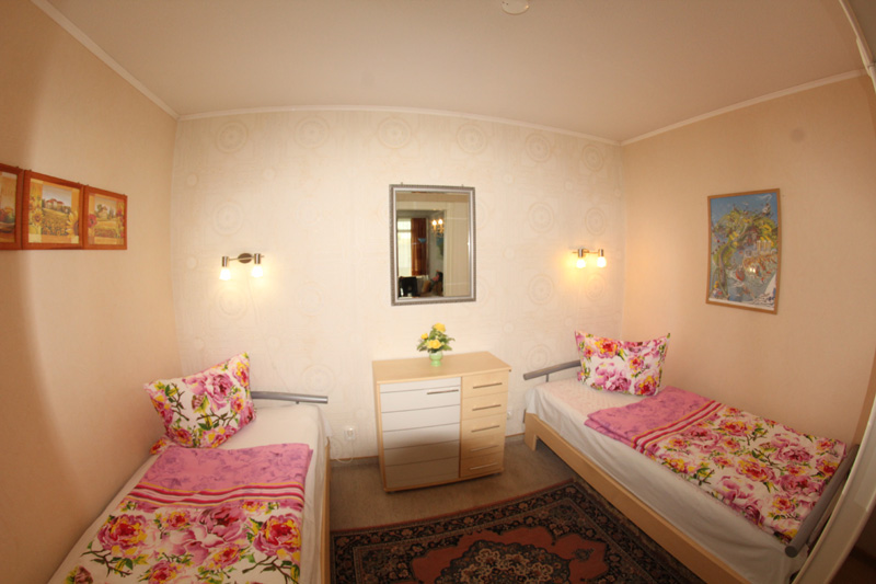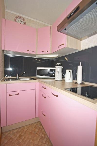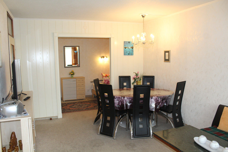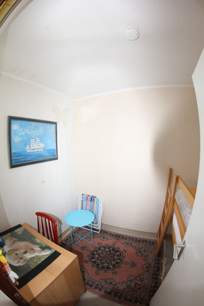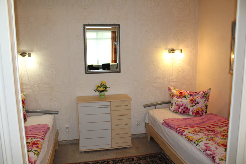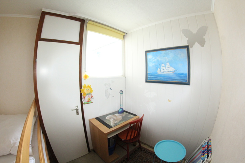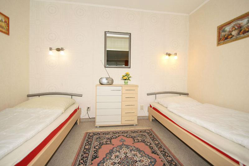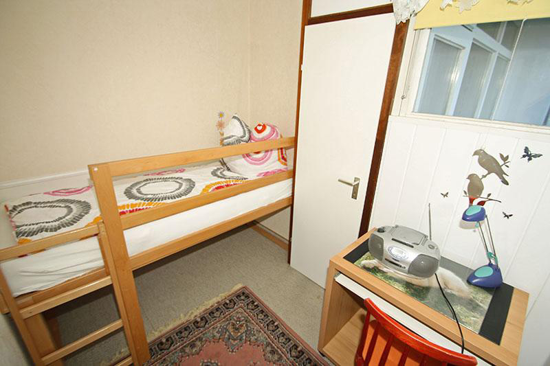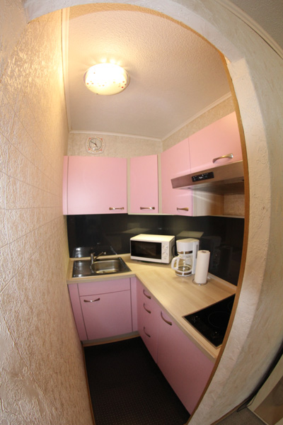 Weiter gelangt man vom Flur in den offenen Wohn- und Essbereich. Abgetrennt vom Wohn und Esszimmer befindet sich hier noch ein separater Schlafbereich, in dem zurzeit zwei Einzelbetten untergebracht sind. Vom Wohn- und Essbereich gelangt man über eine Terrassentür auf die Loggia. Eine große Fensterfront sorgt dafür, dass viel Tagelicht in den Wohnbereich strömt. Gegenüber vom Wohn- und Essbereich befindet sich die kleine und moderne Einbauküche. Diese verfügt über alle erforderlichen Geräte, so dass das zubereiten der Mahlzeiten im Handumdrehen erledigt ist. Zudem befindet sich auf der rechten Wohnungsseite direkt links neben der Küche noch ein weiteres Zimmer. Dieses könnte als Gäste- oder Kinderzimmer genutzt werden. Hier sollten zwei Personen ausreichend Platz zum Schlafen finden.
