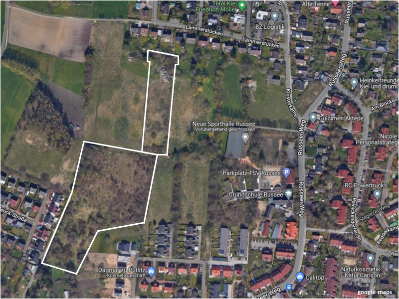 Verkauft werden soll ein landwirtschaftliches Grundstück und Grünfläche in Kiel-Russee. Das Grundstück besteht aus drei Flurstücken und ist 23.258 m² groß. Nutzbar ist das Grundstück als Acker- und Grünland. Die beiden mit Bäumen und Sträuchern bewachsenen Flurstücke befinden sich im Geltungsbereich eines Bebauungsplanes. Für diese beiden Flurstücke ist laut B-Plan eine landwirtschaftliche Nutzung vorgesehen.