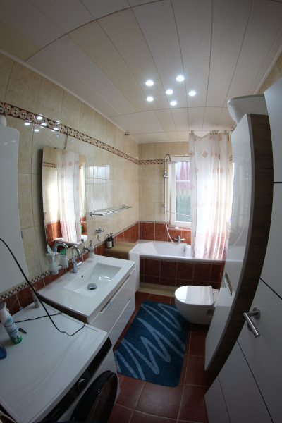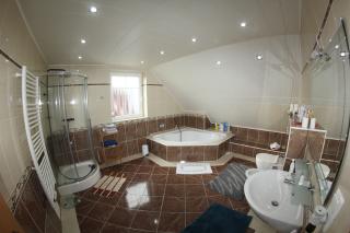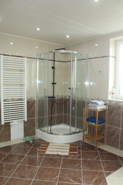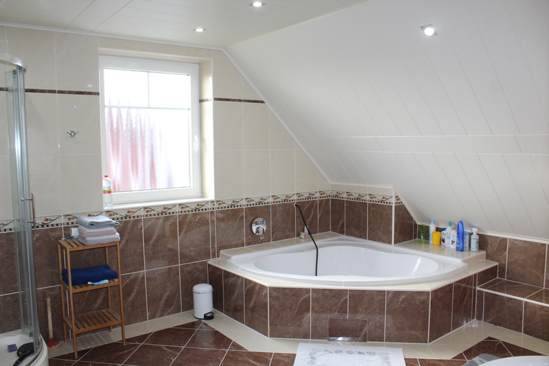 - Großes Badezimmer mit Eckbadewanne, Dusche und Handtuchheizkörper